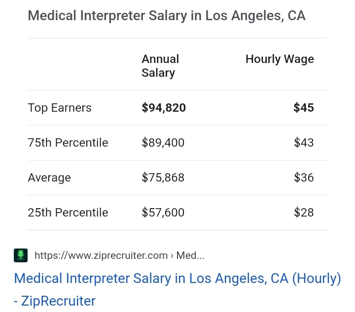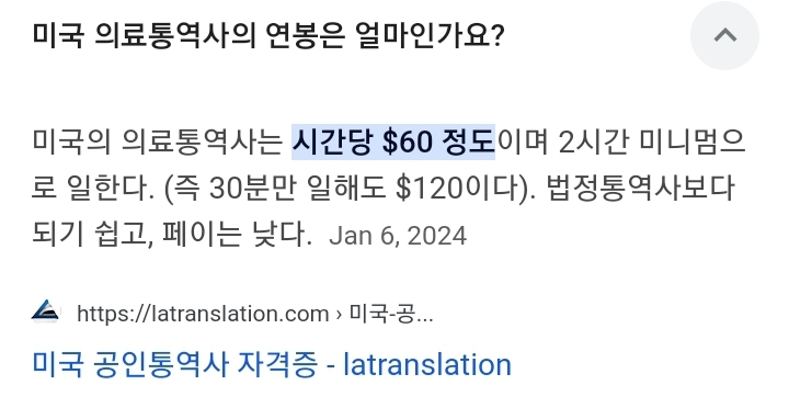 보수: 미친 환율이지만 한국 내에서의 의료통역사의 시간당 보수가 미국에 뒤지지 않거나 오히려 더 잘 받습니다. 회사에 소속된 사람은 잘 모르겠는데, 개인 환자에게 고용되서 일하는 프리랜서로 통역사는 시간당 사만(잘 못함)-팔만 원(컨퍼런스 용 고급 통역사는 십만원)을 받는 것 같았습니다. 숨고에서 한영 통역사를 찾다가 대충 그렇다고 생각합니다. 하지만 의료 쪽은 대체로 오만 원이 넘었던 것 같습니다. 최소한 한국의 일반 간호사나 병원 직원의 시급보다는 많습니다. 국가기관에서 제공하는 의료통역사나 통역 에이전시에서 일하는 분들은 얼마 받는지 잘 모르겠습니다. 또 대형 병원의 국제의료팀에서 일하는 분들의 보수는 잘 모르겠습니다. 찾아보니 풀타임으로 병원에 근무할 경우는 통역업무만으로 채용되는 경우 보다는 다양한 병원 업무 하는 사람이 자기 스펙 중 하나로 의료통역증을 쓰는 것 같습니다. 그에 비해 미국 내에서 에이전시 소속의 의료통역사의 시간당 임금은 시간당 30-35불에 불과했습니다. 개인이 개인 환자고객을 상대로 프리래서로 뛰면 돈을 더 받을 수도 있을 것 같은데, 미국은 전화/화상 통역 에이전시가 하도 많다 보니 병원에서 알아서 통역을 구해줘서 개인이 굳이 의료통역사를 고용하는 상황이 흔할지는 잘 모르겠습니다. 제가 indeed 같은 웹사이트에서 잡 서치를 했을 때 에이전시나 병원이나 통역 에이전시에 소속되어서 퍼디엠(컨트랜터)으로 일하는 한영의료 통역사는 대략 시간당 35불을 받는 것 같았습니다. 이는 미국 내 간호사보다 현저히 적은 금액이고, 일하는 시간 및 인컴도 일정하지 않은 단점이 있습니다. 결국 미국내 의료통역사 중 적지 않은 수가 의료통역사 일을 한 지 몇 년 후에 다른 의료직업군으로 이직해서 미국은 만성적으로 의료통역사가 부족하다고 합니다.