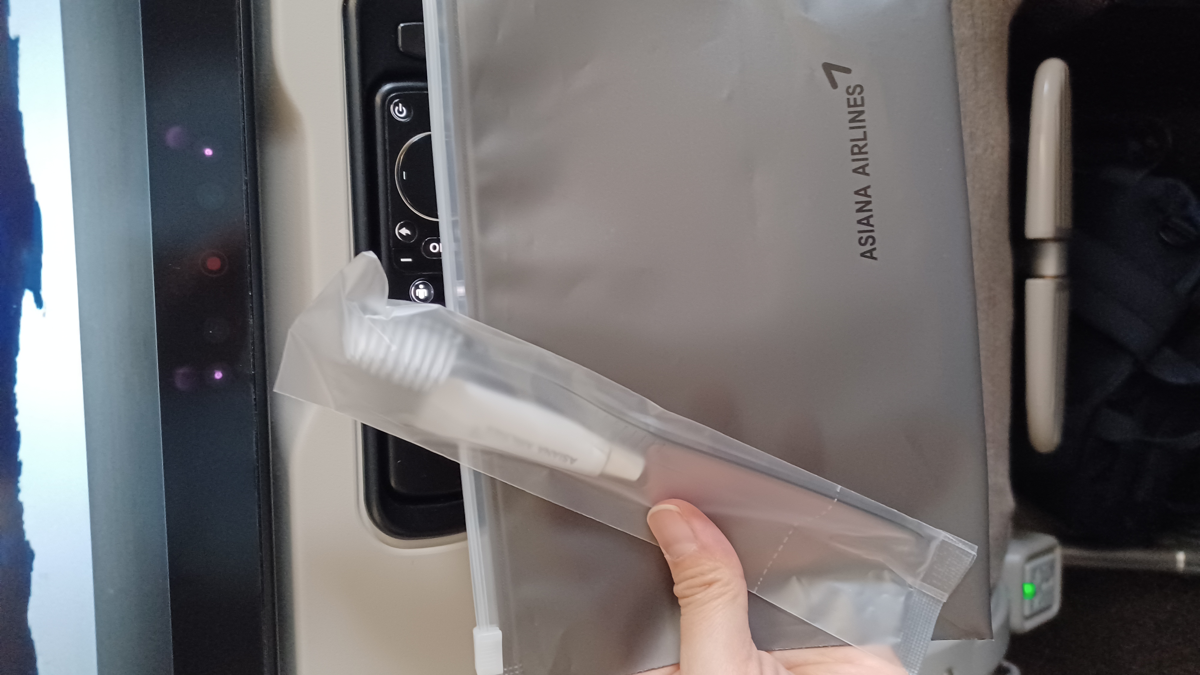키트 주머니에 일회용 슬리퍼와 칫솔 치약이 있었습니다.