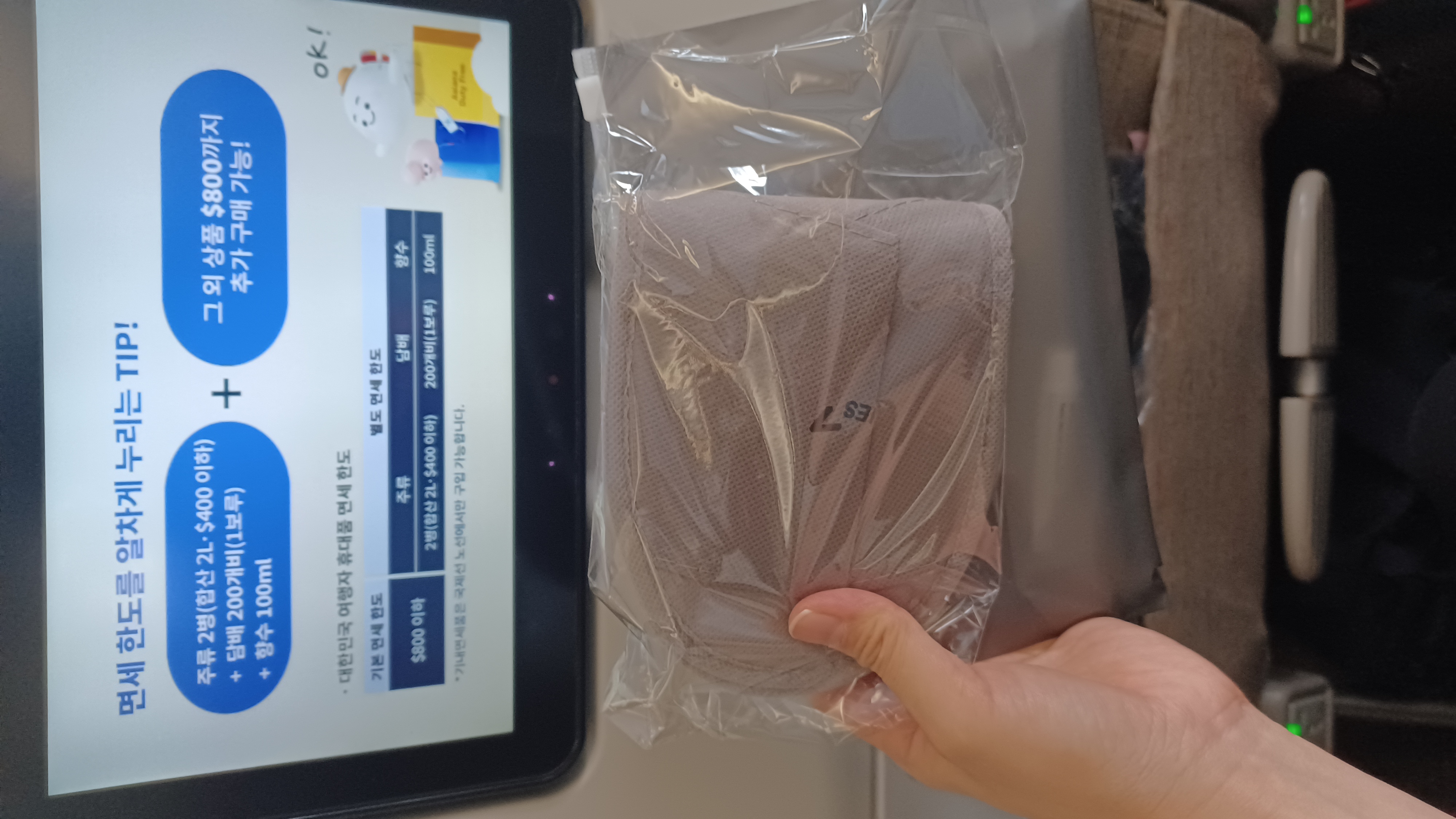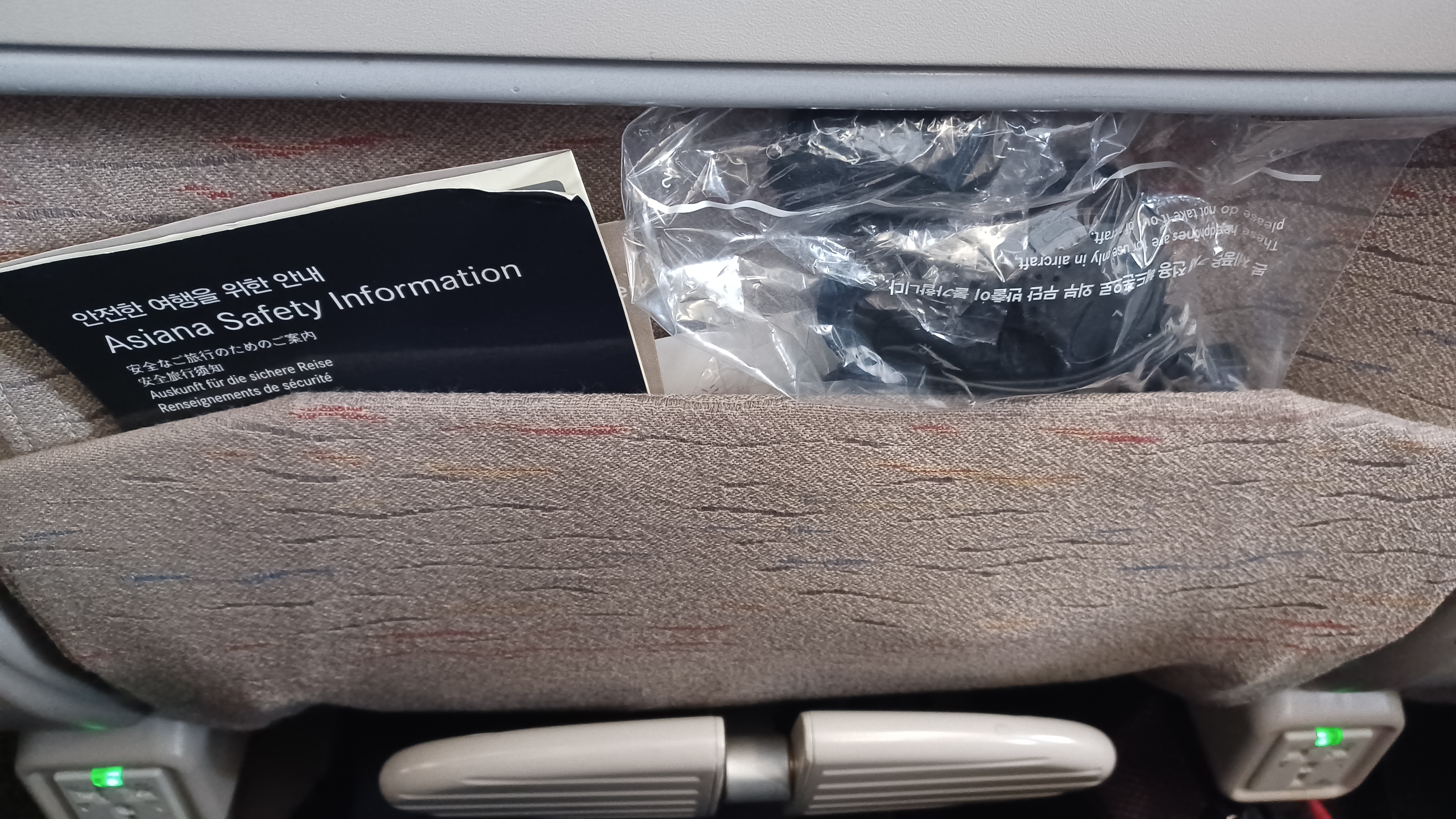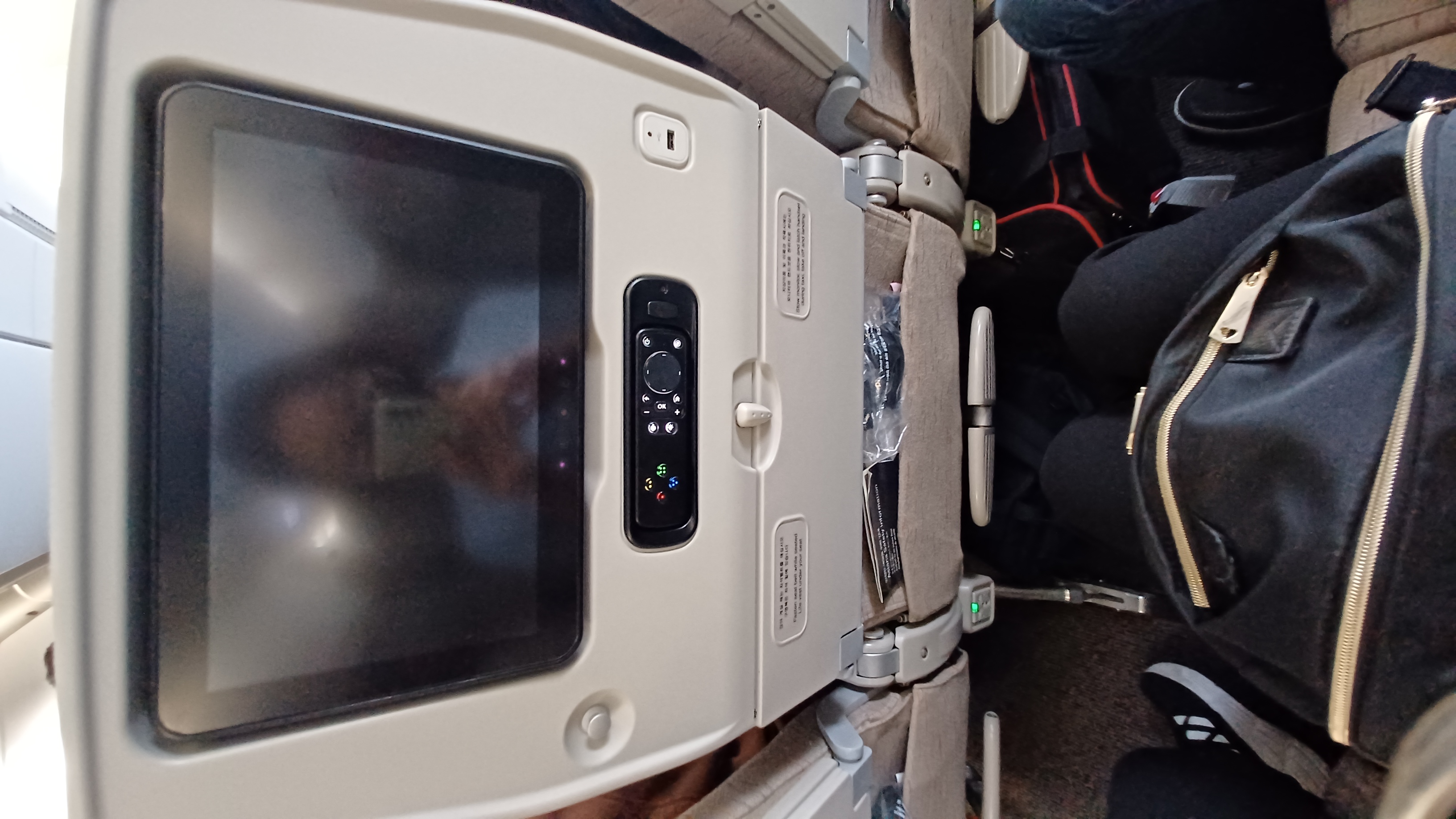 앞 좌석 등받이 뒤로 충전포트나 전원 콘센트가 있어서 핸드폰 충전 잘하면서 비행했습니다.