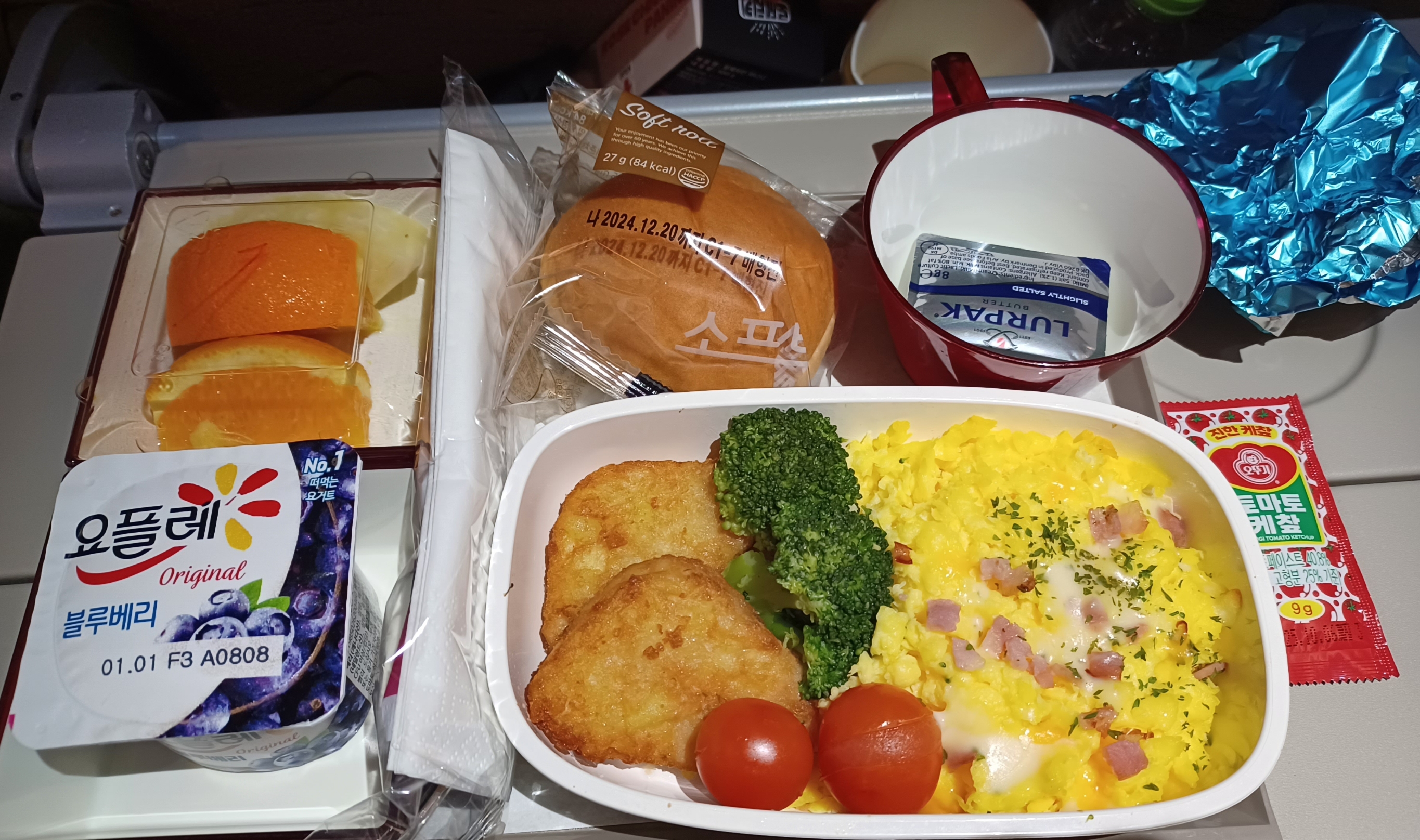 착륙 한 시간 반 전쯤에는 아침식사로 스크램블 에그와 전복죽 두 메뉴 중 하나를 선택하셨습니다. 제가 선택한 스크램블 에그에는 스크램블에그, 살짝 익힌 방울토마토, 브로콜리, 해시브라운, 디너롤, 과일(오렌지 등), 요거트가 나왔습니다. 짜지 않고 무난하게 잘 먹었습니다. 문제는 제가 배가 꺼지지 않는 상태에서 계속 먹다 보니까 체를 해서 비행기에서 내려서 입국심사를 하는 동안 소화제를 급히 먹었습니다.