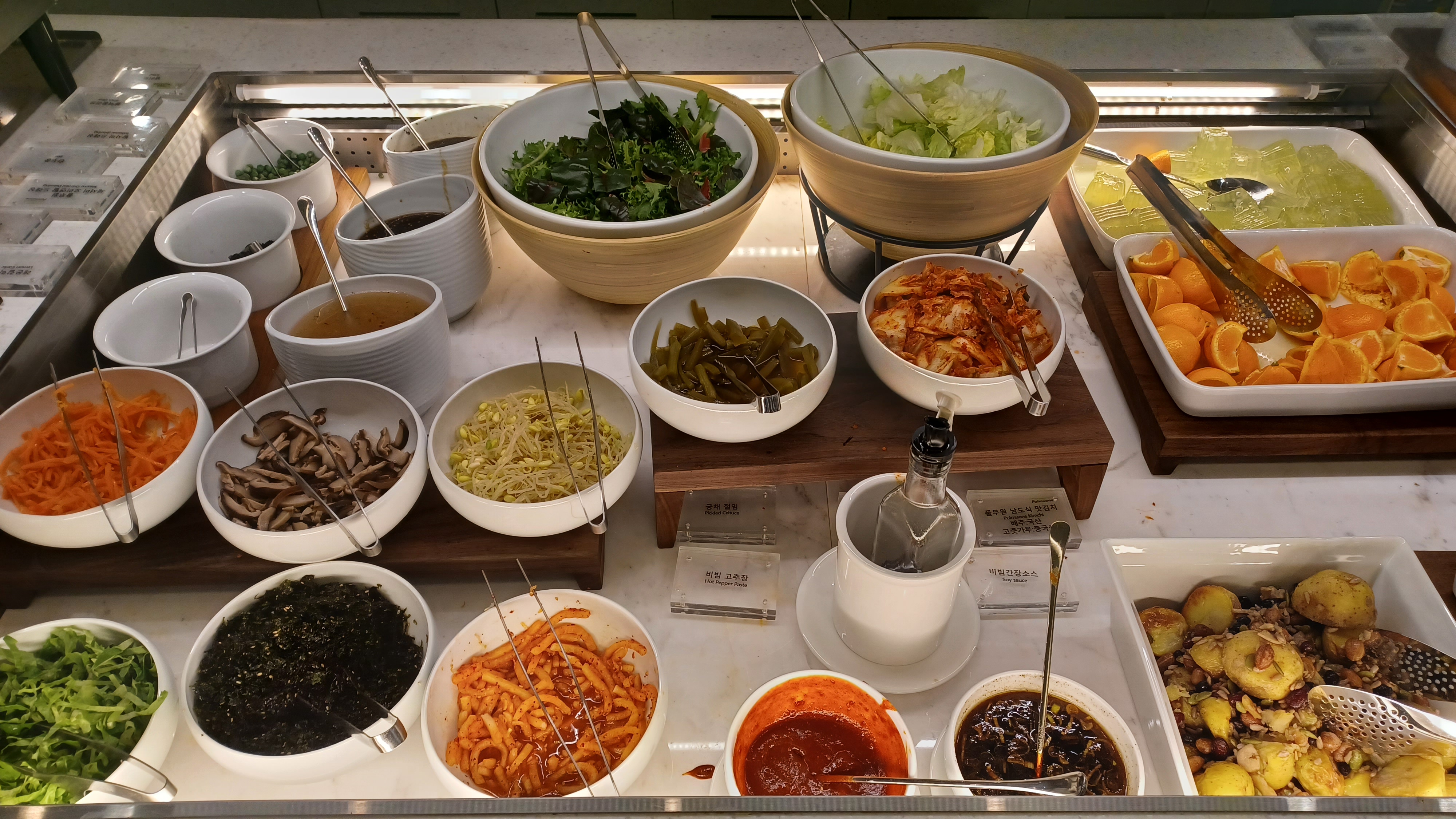 비빔밥 및 샐러드 바. 제대로 비빔밥을 먹을 수 있으면 한 끼 제대로 먹을 수도 있는데, 제가 쌀을 먹으면 체를 잘해서 안 먹었습니다.