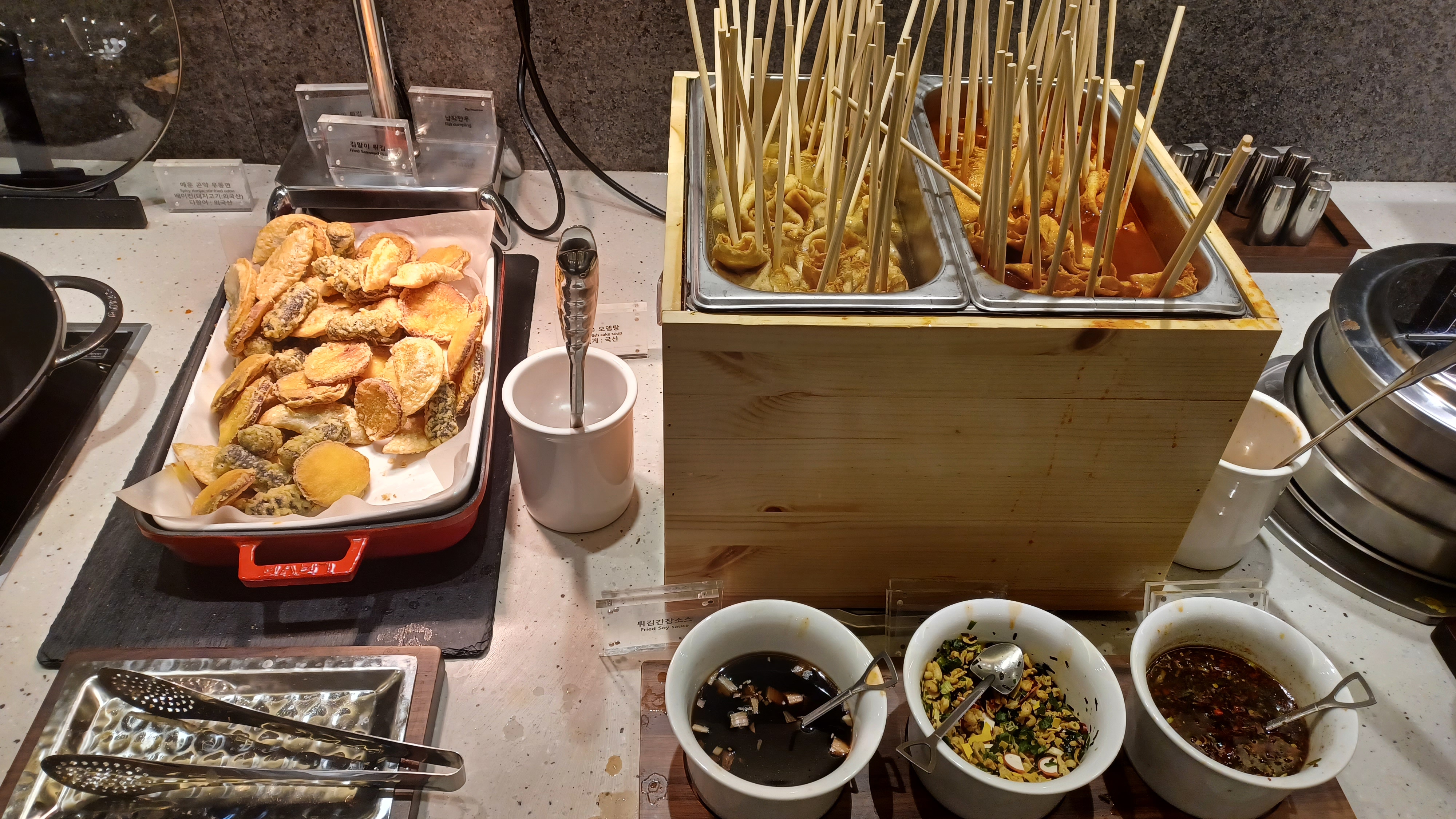 고구마, 김말이, 만두 튀김과 어묵과 매운 어묵