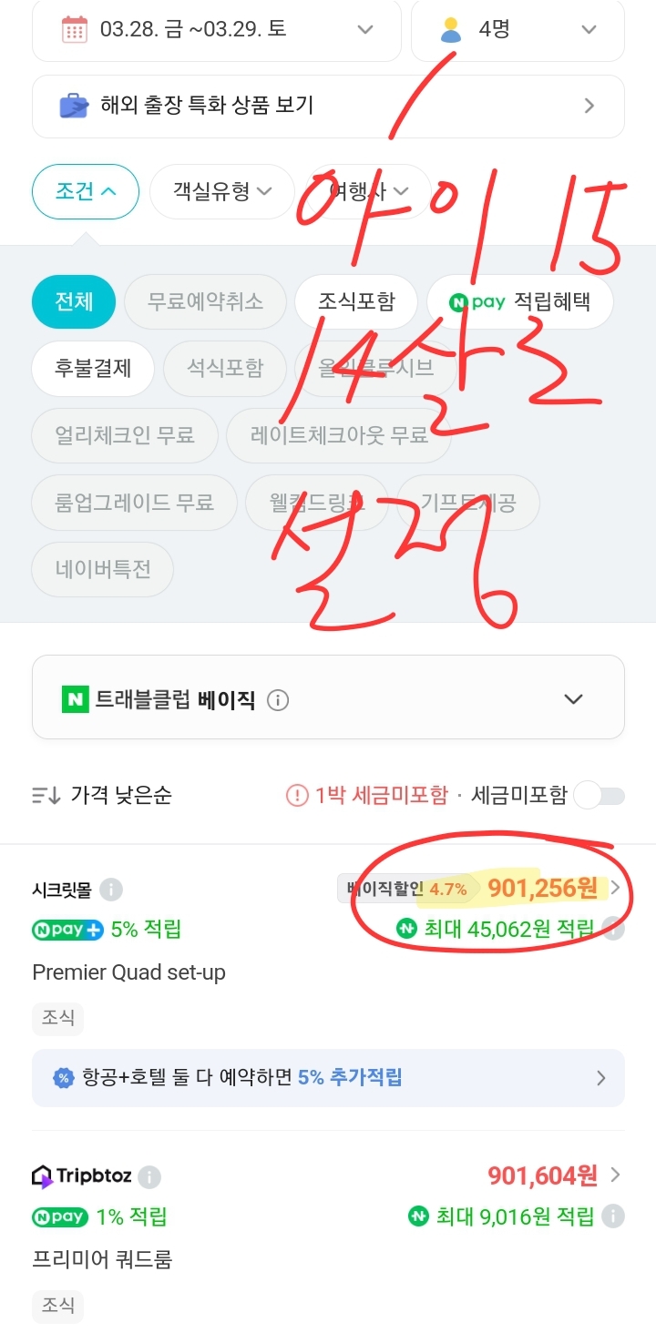 아이 둘 다 14, 15살로 검색했더니 프리미어 쿼드 셋업 방으로 90만 원이 넘습니다.