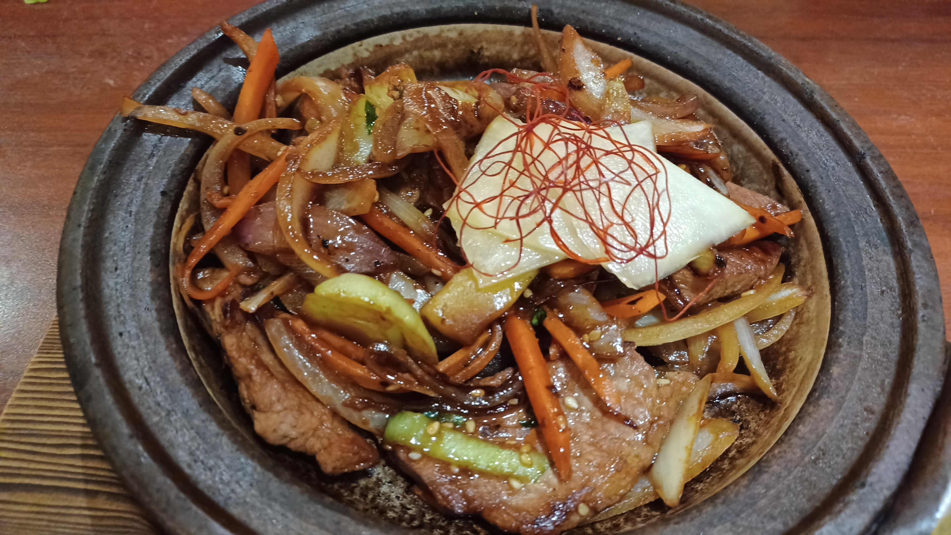 절인 파파야 슬라이스를 올린 일본식 돼지 양파볶음
