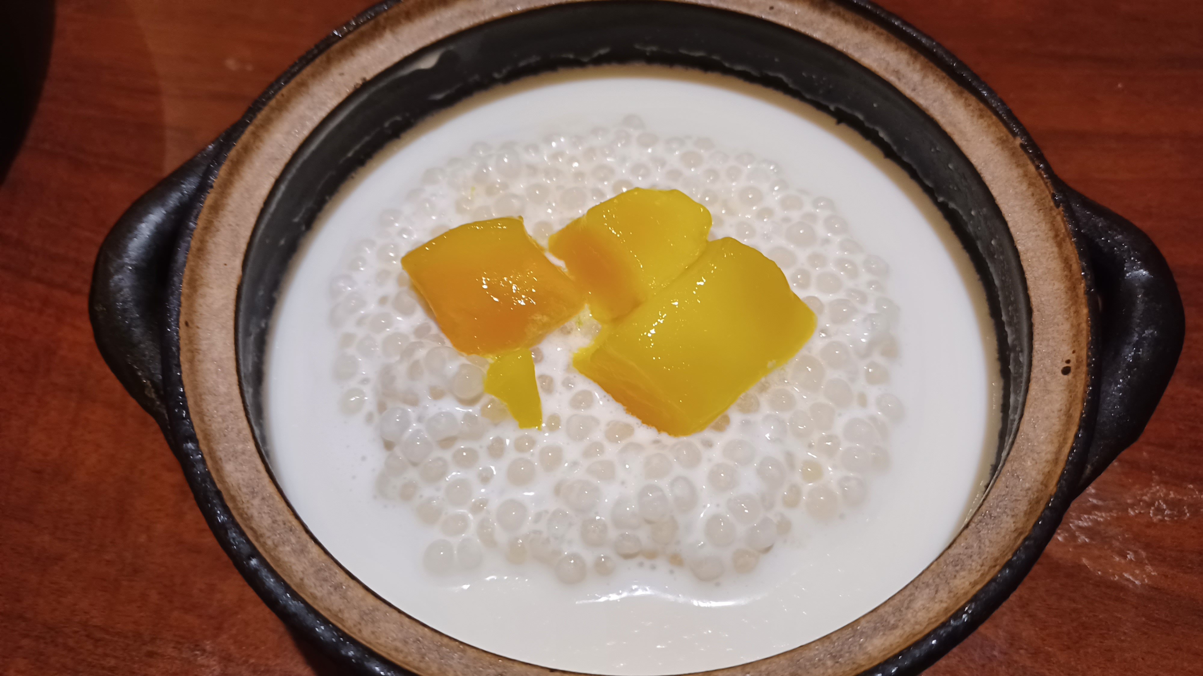 망고를 올린 타피오카 푸딩이 디저트로 나왔습니다.