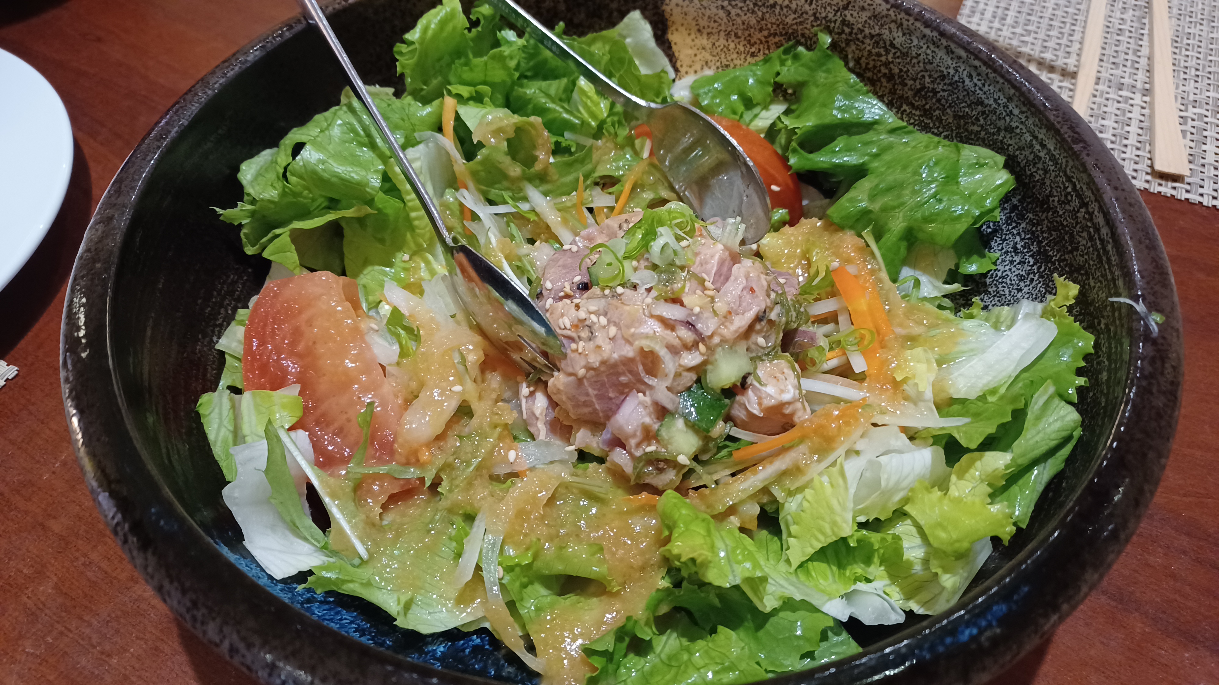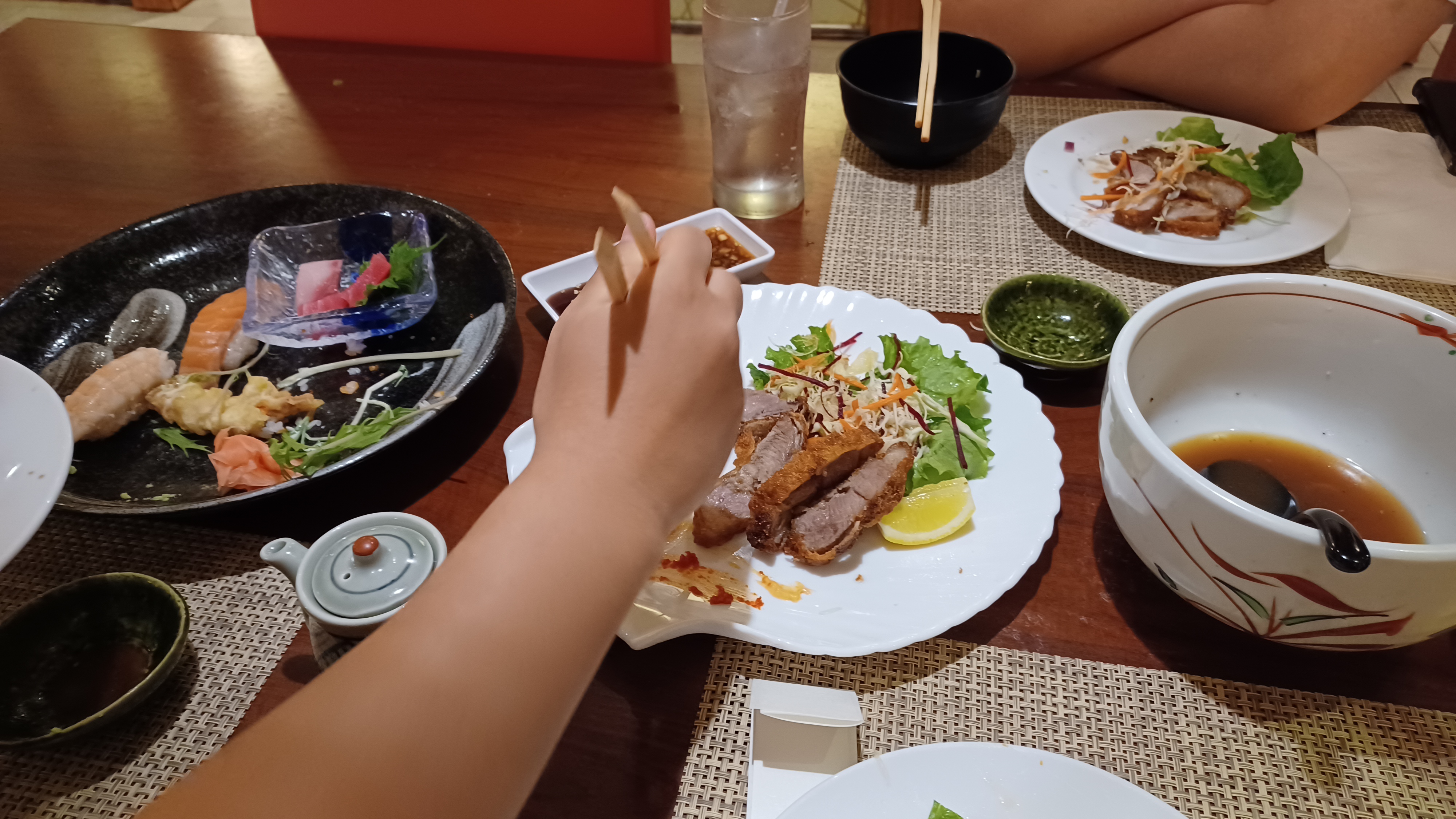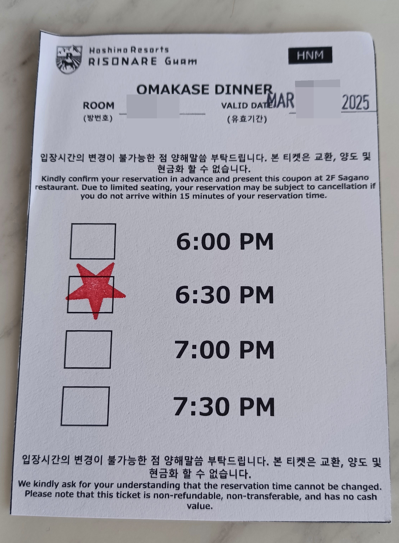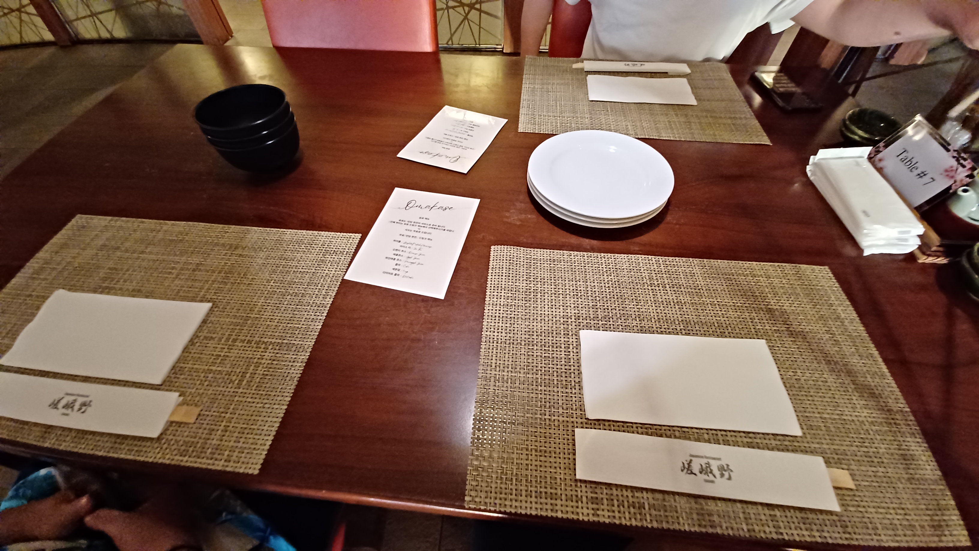 이번 괌 여행에서는 호시노 리조나레, 구 온워드 리조트에서 머물렀습니다. 저희가 여행상품을 구매한 여행사인 모두투어에서 호시노 리조트 내 일식당인 사가노에서도 석식을 제공해 주었습니다. 석식 스케줄은 여행사에서 정해주었고, 저희는 수락했습니다. 괌에 도착해서 호텔 체크인 했을 때 사가노 석식 쿠폰을 주었습니다. 석식을 먹는 날에 예약시간보다 십분 일찍 도착해서 입구에서 쿠폰을 제시했는데, 저희 테이블로 바로 안내가 되었습니다. 일인당 음료를 고를 수 있어서 저희는 각각 하이볼, 아이스티, 세븐업을 주문했습니다. 식사는 일식과 차모로식을 조합한 퓨전 음식 오마카세라 설명을 들었으나, 음식 서빙 간격이 짧고 제가 음식 먹는 속도가 느려서 나중에는 음식 몇 접시를 테이블에 두고 식사를 하게 되었습니다. 접시나 대접 안의 음식을 나누어 먹는 식이었는데, 나눔 젓가락이나 스푼이 따로 제공되지는 않아서 아쉬웠습니다. 음식맛은 퓨전 이래서 맛의 기준이 없어서 좀 애매했으나 그럭저럭 맛있게 먹었습니다. 물론 전통 일본식의 스시 질, 쌀밥의 보송보송함, 데푸라의 바삭함을 기대하면 실망할 수 있습니다.