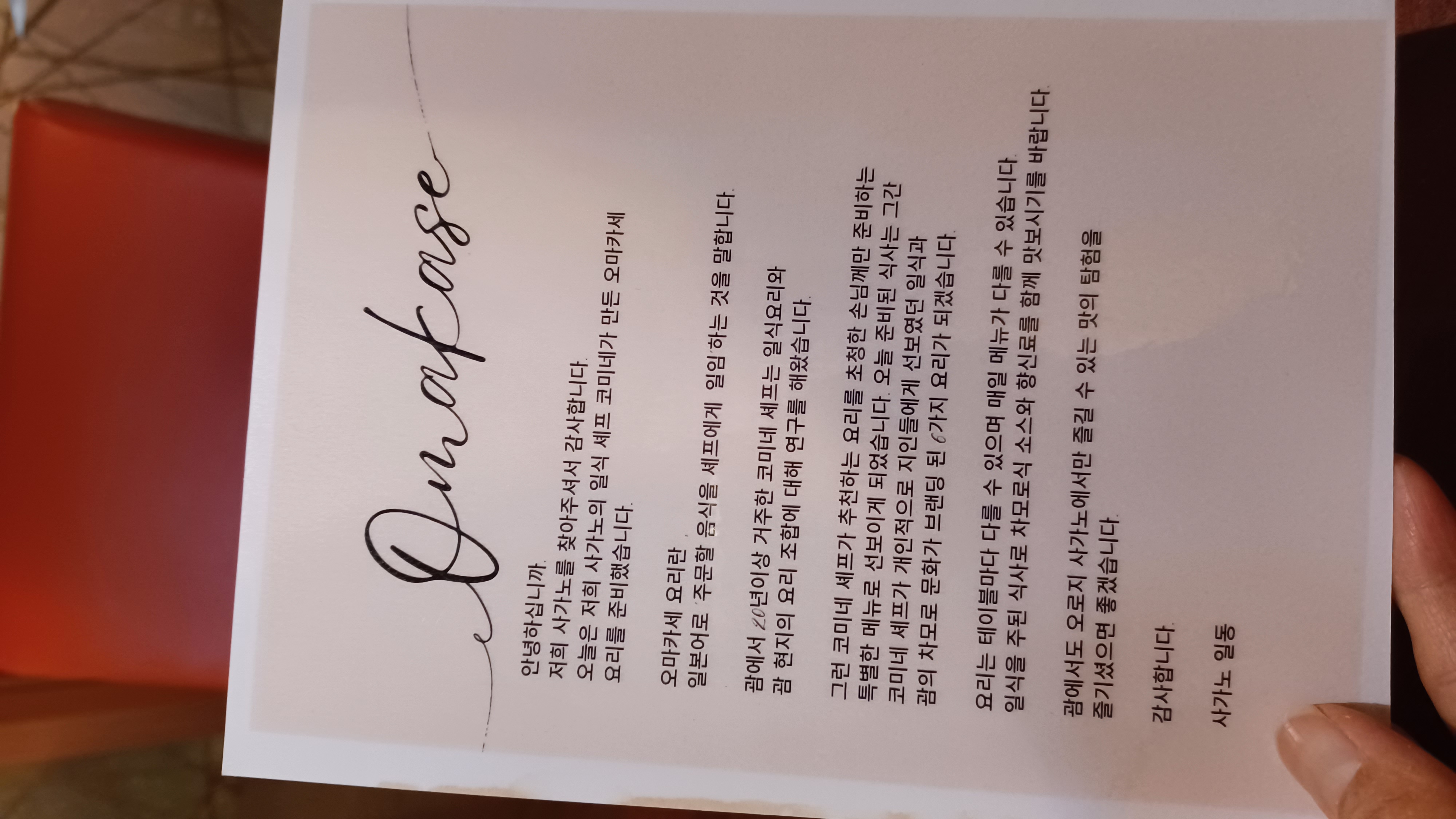 일식+차모로 퓨전 오마카세를 먹는다는 설명서를 받습니다.