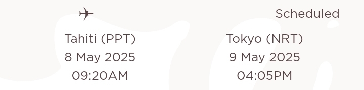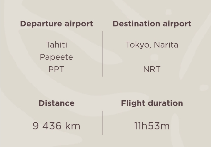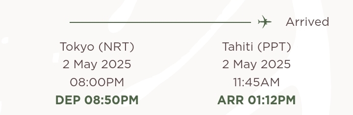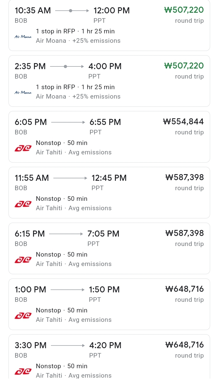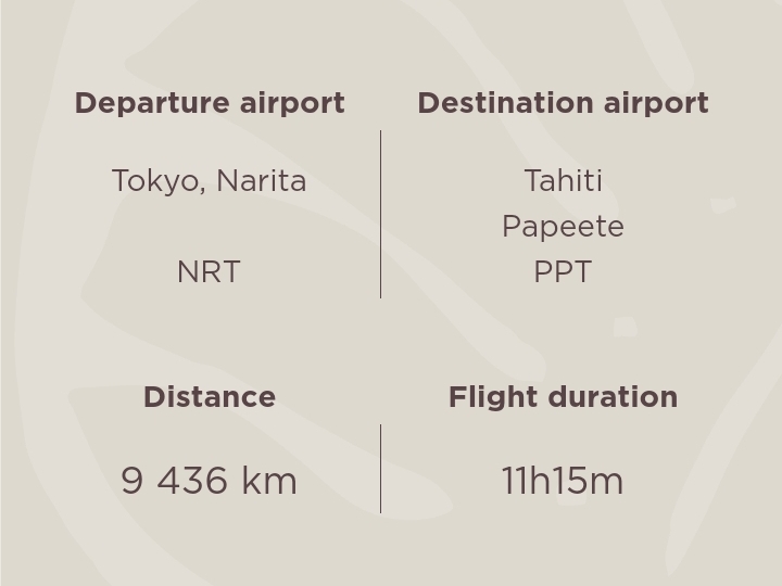 인천에서 타히티와 보라보라를 여행하는 정보를 간단히 정리한다. 인천국제공항에서 타히티에 가는 가장 빠른 방법은 나리타 공항에서 환승을 하는 것이다.운항사는 에어 타히티 누이이고, 매 화요일과 금요일에 출발한다. 반면 타히티 파피테 공항에서 일본 나리타 공항행 비행기는 월요일, 목요일에 출발한다. 성인 왕복 기준 110만-120만 원이 든다.
