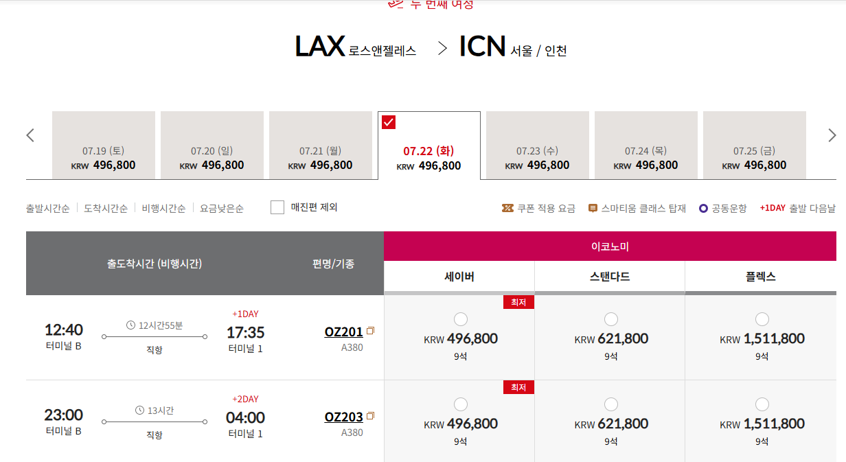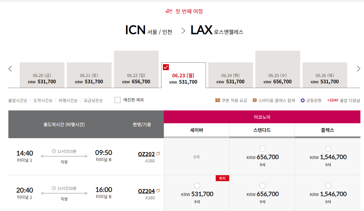 아시아나에서 6월-7월 사이에 한국 발 비행기표를 너무 싸게 팔고 있다. 인천에서 로스앤젤레스 가는 표가 인천에서 로스앤젤레스 가는 표는 53만 원 대, 로스앤젤레스에서 인천 가는 표는 49만 원 대에 팔고 있다. 이번 여름에는 미국 방문이 힘들어서 못 가겠지만, 내년에는 초여름 시기에 미국에 다녀오면 여러모로 경제적일 것 같다.