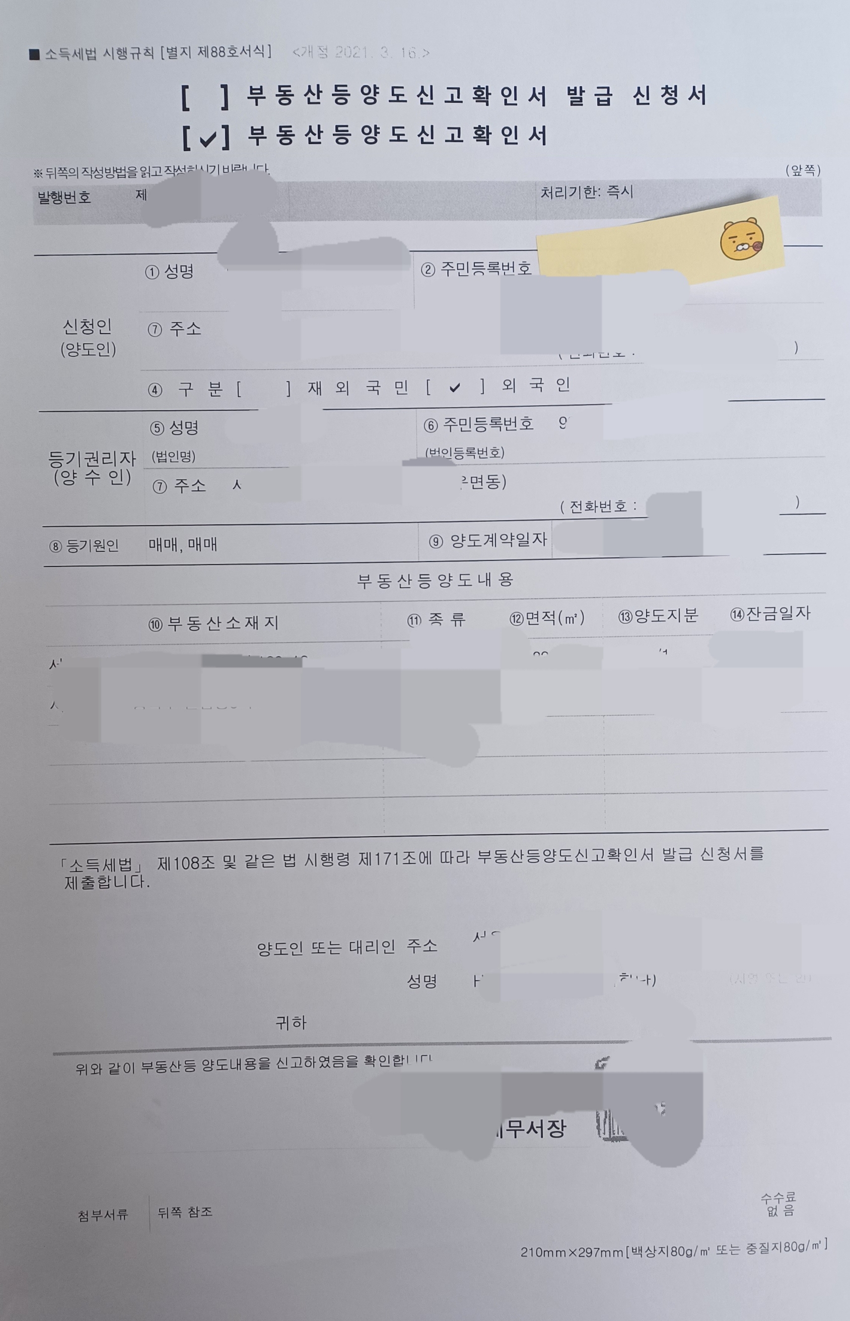 외국인이라면 잔금 전에 이 폼을 제출하면서 예상 양도소득세를 내야 합니다. 외국인은 언제라도 외국으로 도주할 수 있기 때문에, 그리고 실제로 그런 사례가 있기 때문에 양도소득세를 잔금 전에 내야 하고, 양도 신고 및 세금 냈다는 확인증을 받아야 하는 것 같습니다.