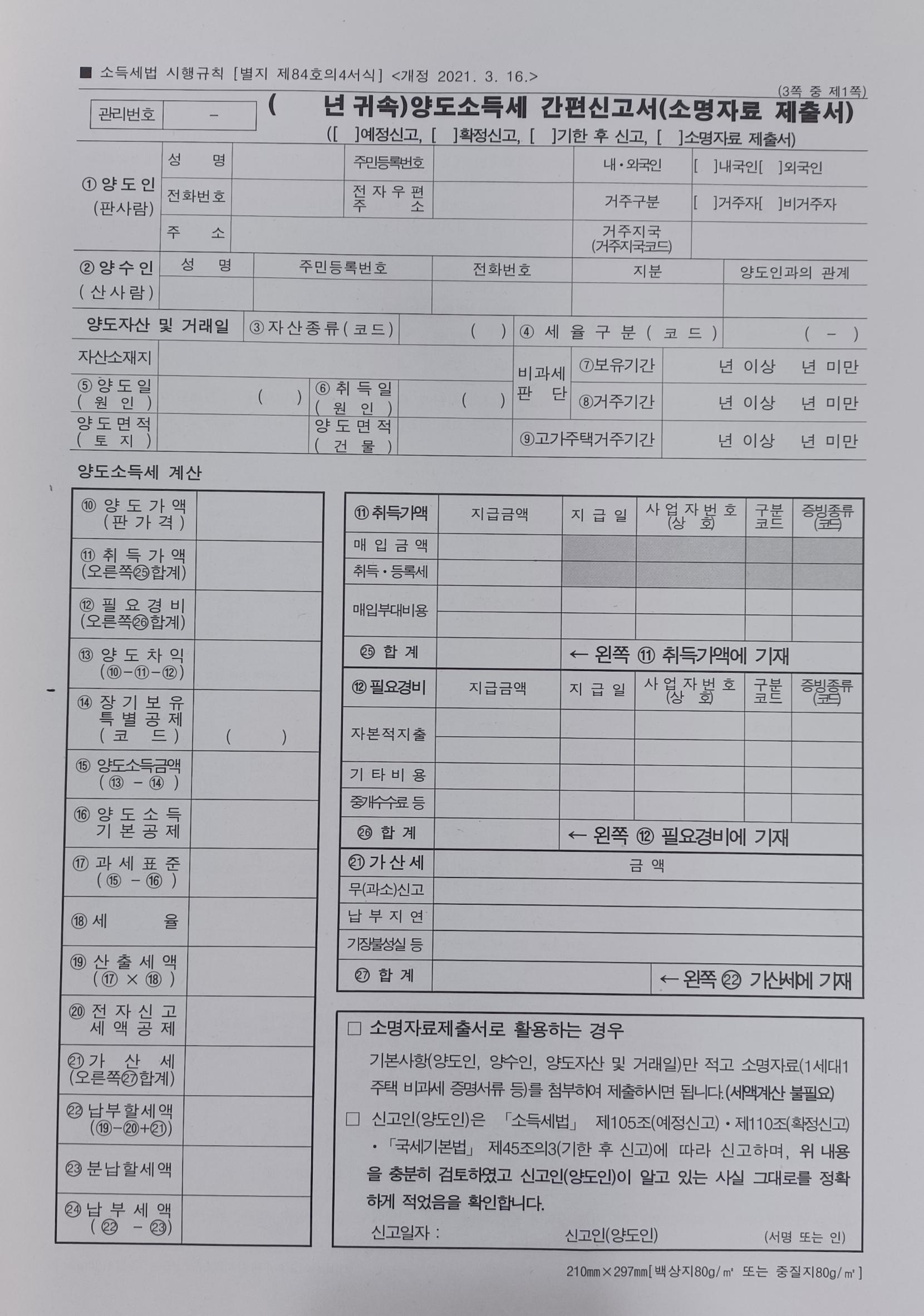 저는 셀프로 진행했습니다. 우선 관내 세무서 1층의 양도소득세 신고하는 민원실로 가서 양도신고와 양도신고확인서를 신청합니다. 직원이 다음과 같은 용지 두 장을 쓰라고 합니다.
