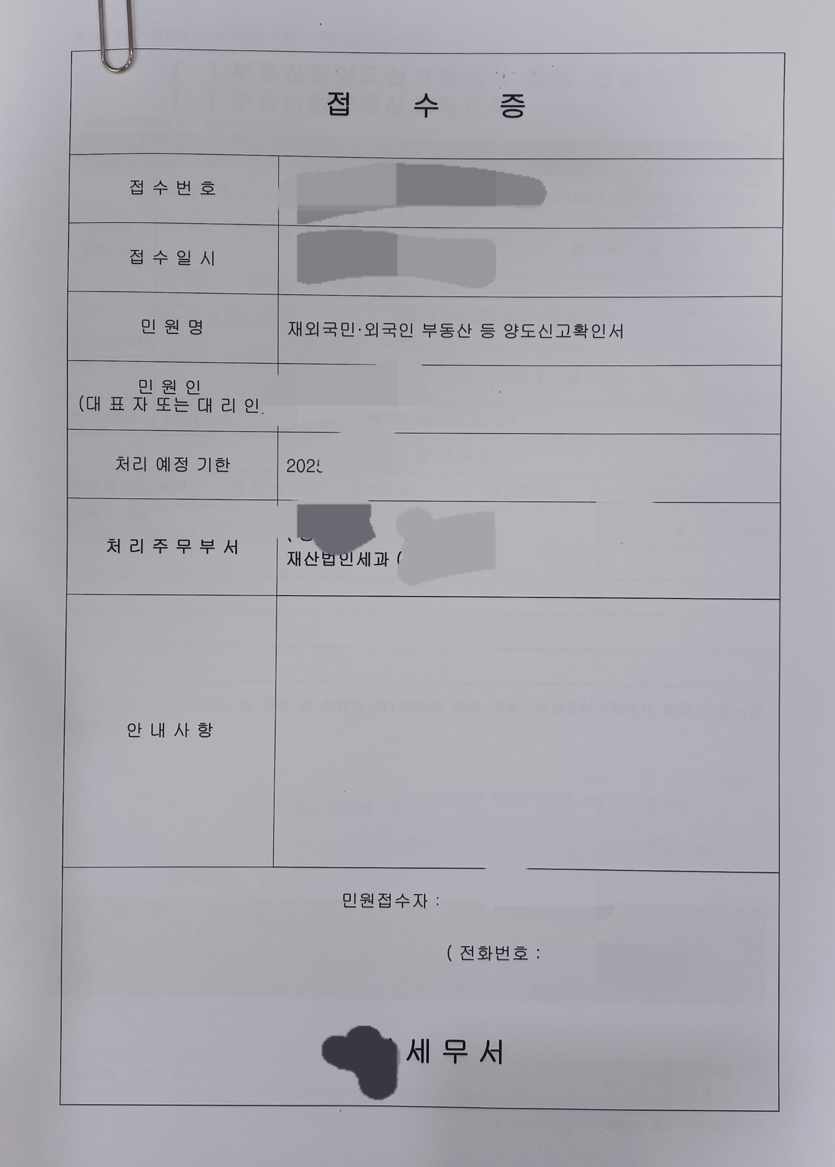저는 동포비자 F4로 한국에 거주하고 있는 외국 국적자입니다. 최근 제 개인명의였던 부동산을 손해 보면서 매도 진행 중입니다. 제가 경험한 매도 과정을 정리해 보았습니다. 부동산에서 하는 계약, 계약금ㅡ> 중도금까지는 보통 한국인과 동일하게 진행됩니다. 다만 잔금 전에 외국국적자로 양도소득신고 및 양도신고 확인서를 받는 것이 달랐습니다.