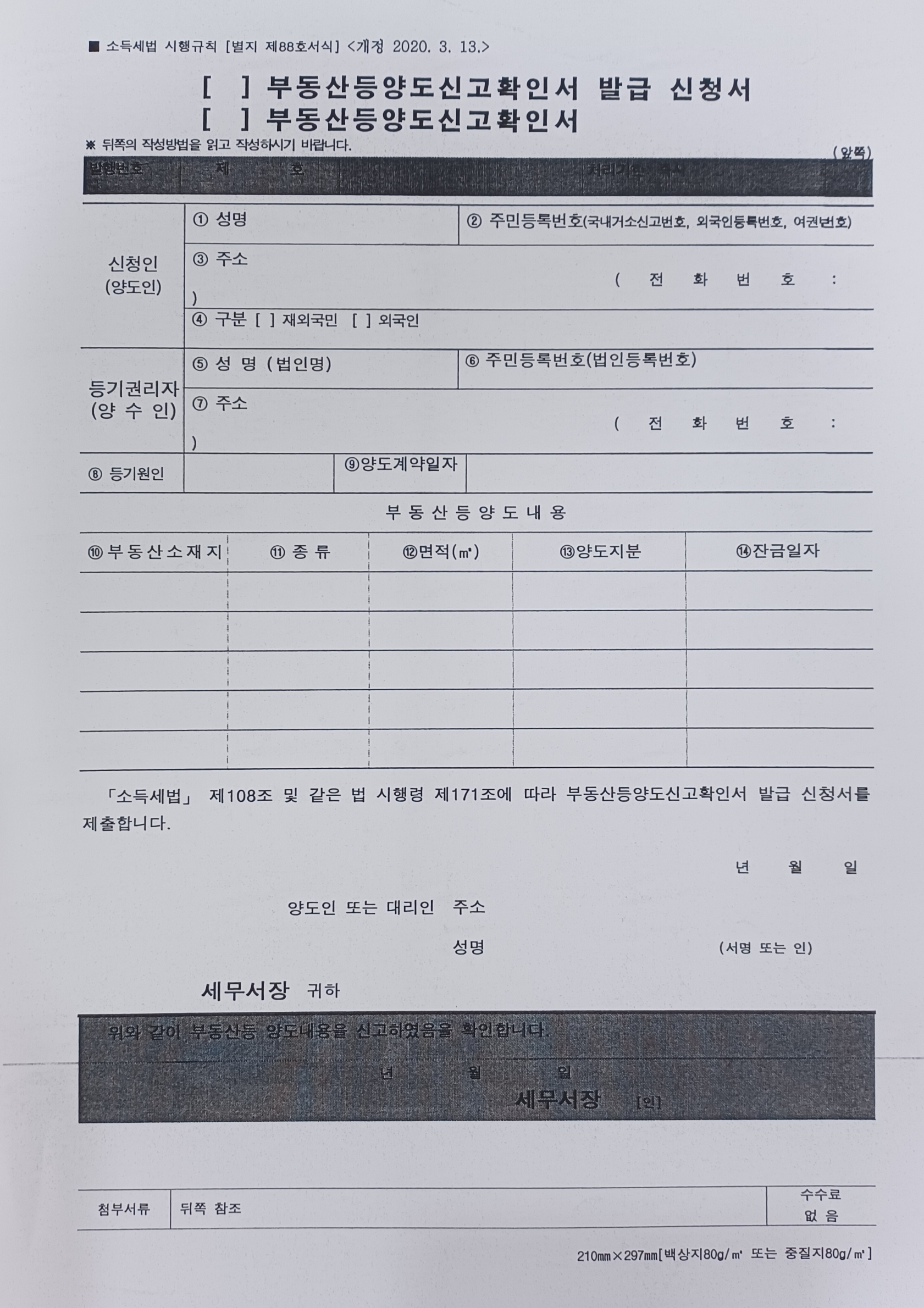 저는 셀프로 진행했습니다. 우선 관내 세무서 1층의 양도소득세 신고하는 민원실로 가서 양도신고와 양도신고확인서를 신청합니다. 직원이 다음과 같은 용지 두 장을 쓰라고 합니다.