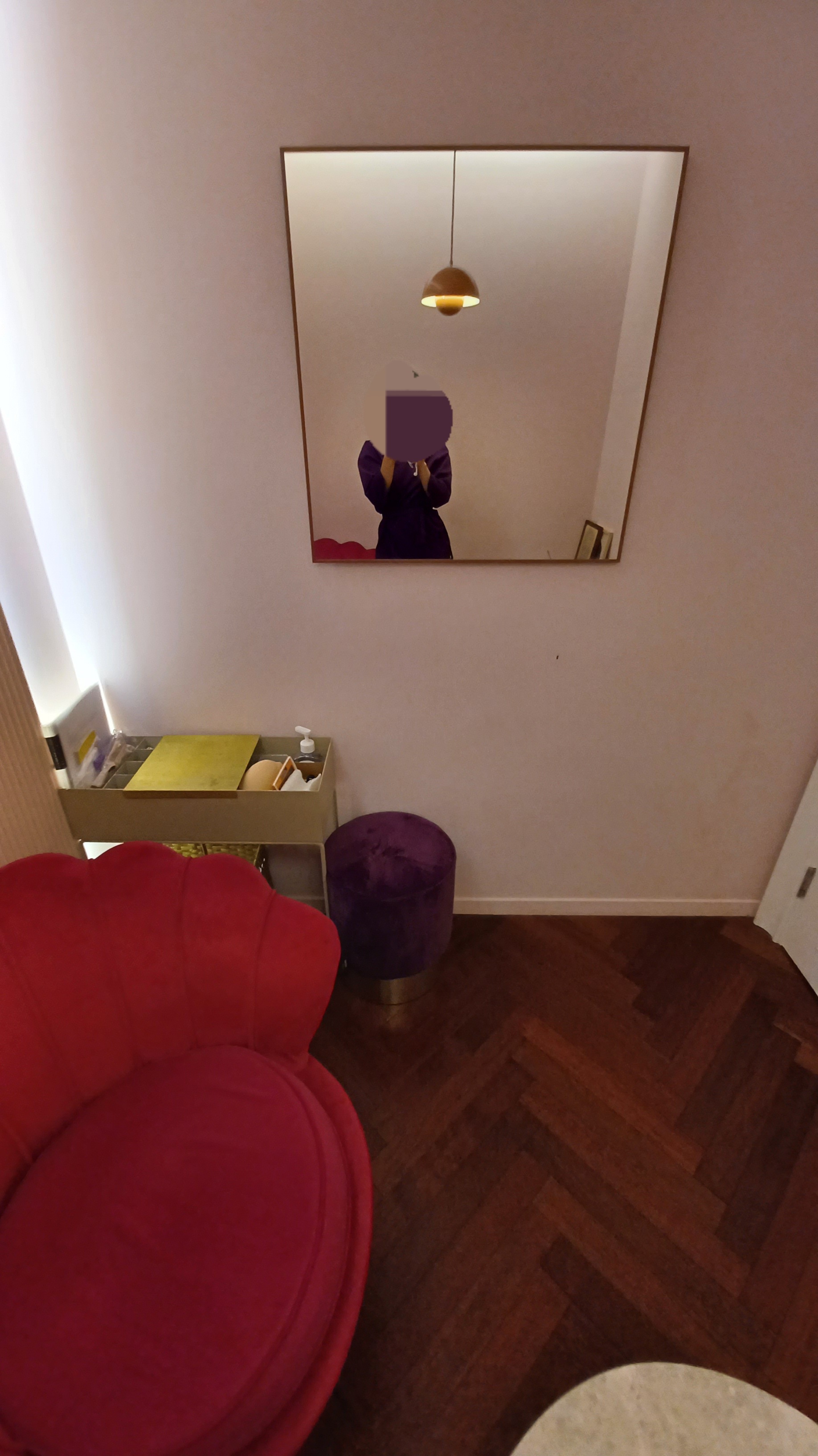 저는 상의만 탈의하고 보라색 가운을 입었어요.