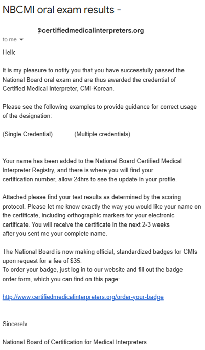 3번의 도전 끝에 의료통역사 NBCMI 구술 시험에 합격했습니다. 이로써 CMI-Korean, 영한 의료통역사로 인증을 받게 된 셈입니다.