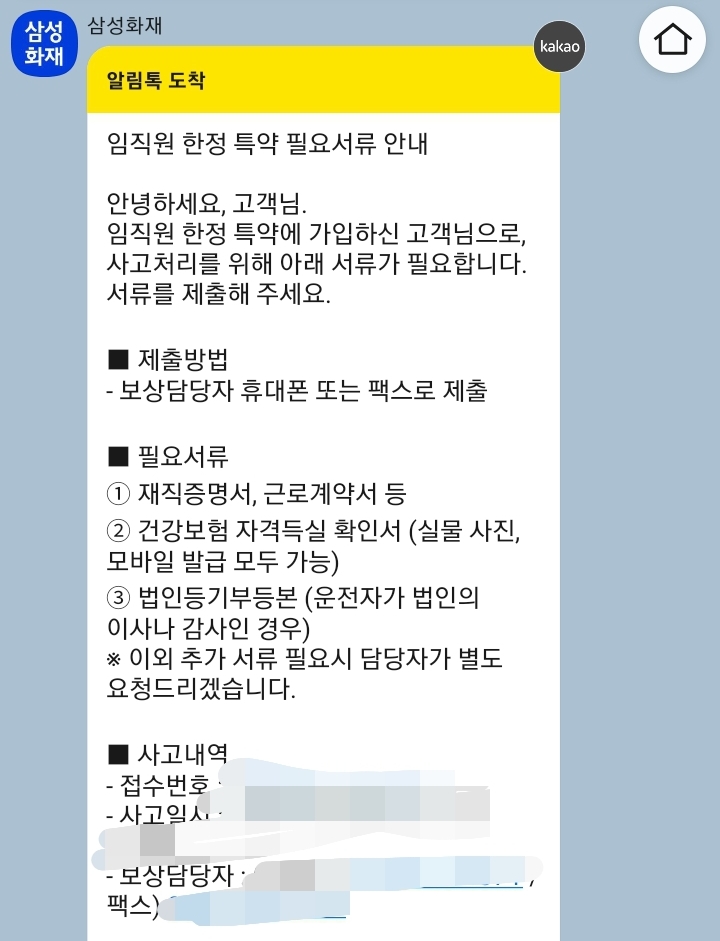 이후 삼성화재 알림톡으로 사고처리 진행사항을 알리는 톡을 보내주었습니다.