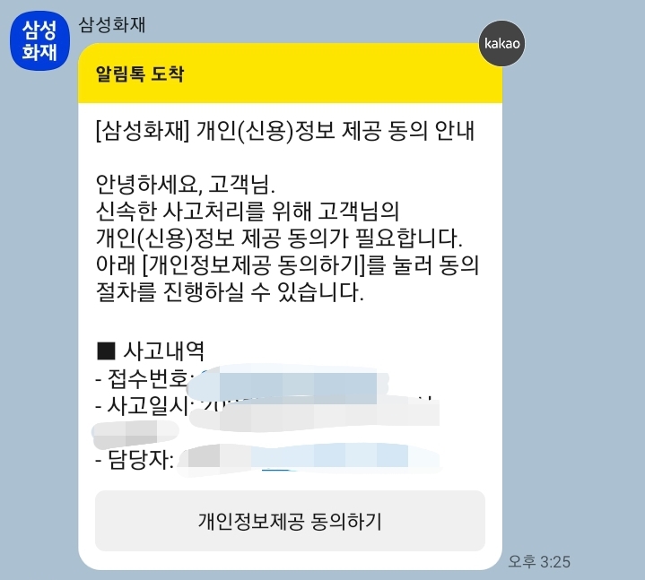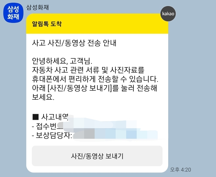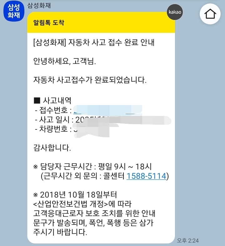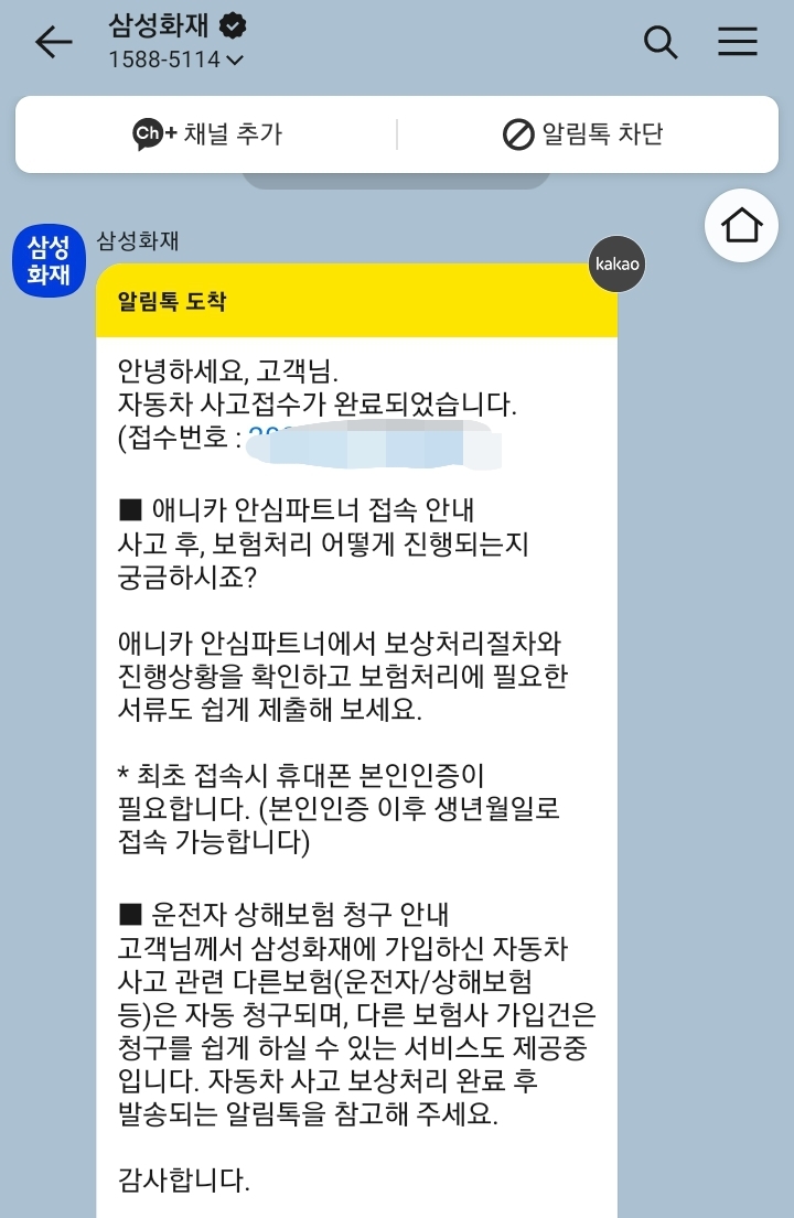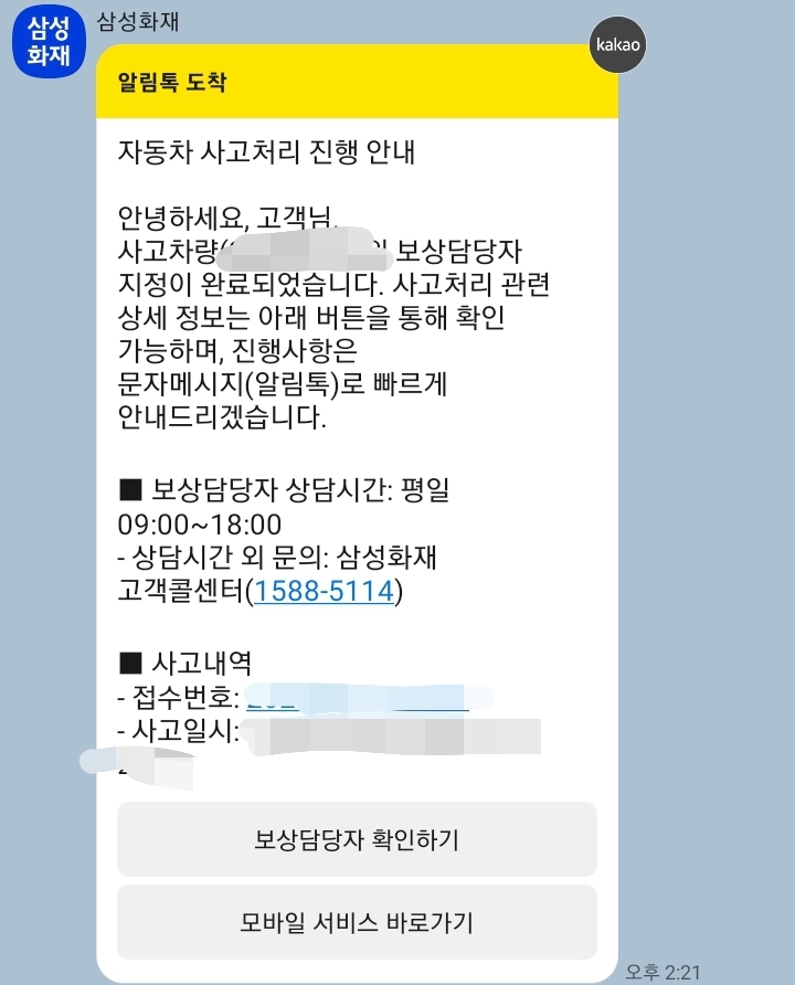 이후 삼성화재 알림톡으로 사고처리 진행사항을 알리는 톡을 보내주었습니다.
