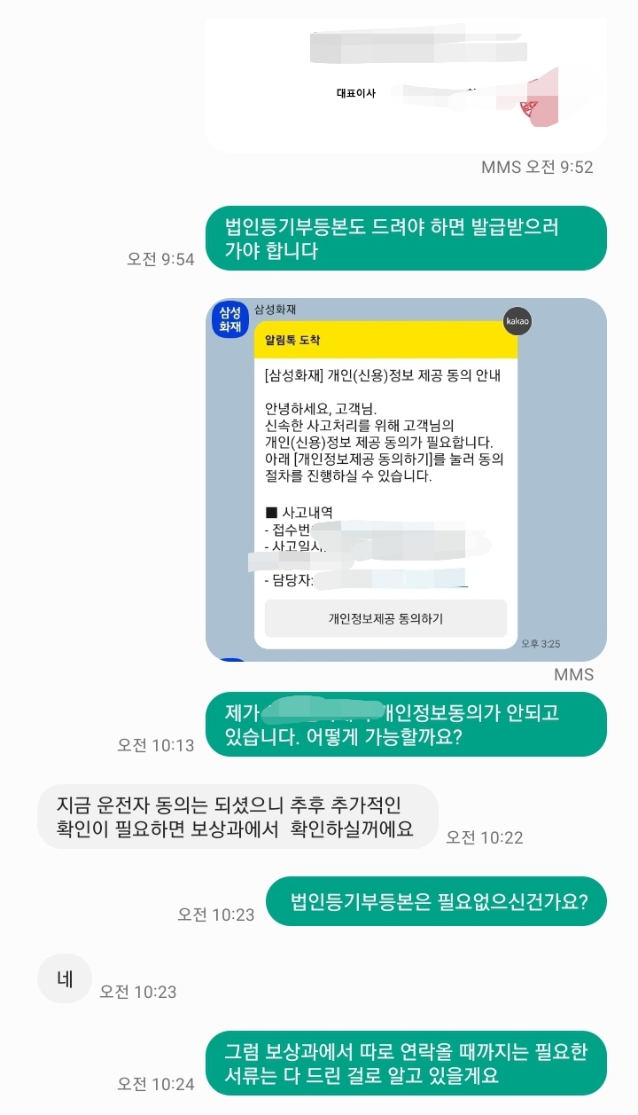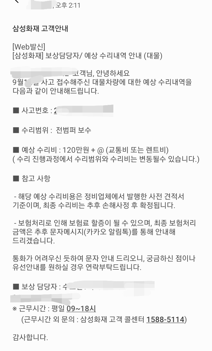 이렇게 오전에 서류를 보내고 나니 오후 두 시쯤 삼성화재 보상과에서 전화가 왔습니다.