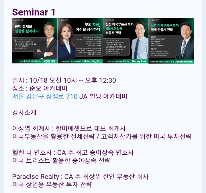 저는 한국에서 거주하고 있는 미국시민권자입니다. 미국 한국 양국에 세금보고를 해야하는 상태라 한미 크로스보더 자산 투자와 절세를 종종 알아봅니다. 그런데제가 미국 세무 관리해서 충격적으로 깔끔하게 잘 알려주시는 미국 회계사를 알게 되었습니다. 그것은 한미에셋프로의 이상엽 회계사입니다. 지난 여름에 지오플랫 유튜브와 미국 세금 세미나에서 처음뵙고 너무 감명을 받았습니다. 다시 한국에 오시면 세미나를 다시 받고 싶었는데, 그분께서 마침 이번 10월 중에 한미 세금 전문가, 변호사, 부동산 중개인 등과 공동으로 세미나를 열게 되었습니다. 아직 자리가 남아있다고 하니 아래의 구글 닥스에서 예약이 가능합니다. 3시간짜리 세미나 당 7만 7천 원이라고 하니, 저렴한 편입니다.