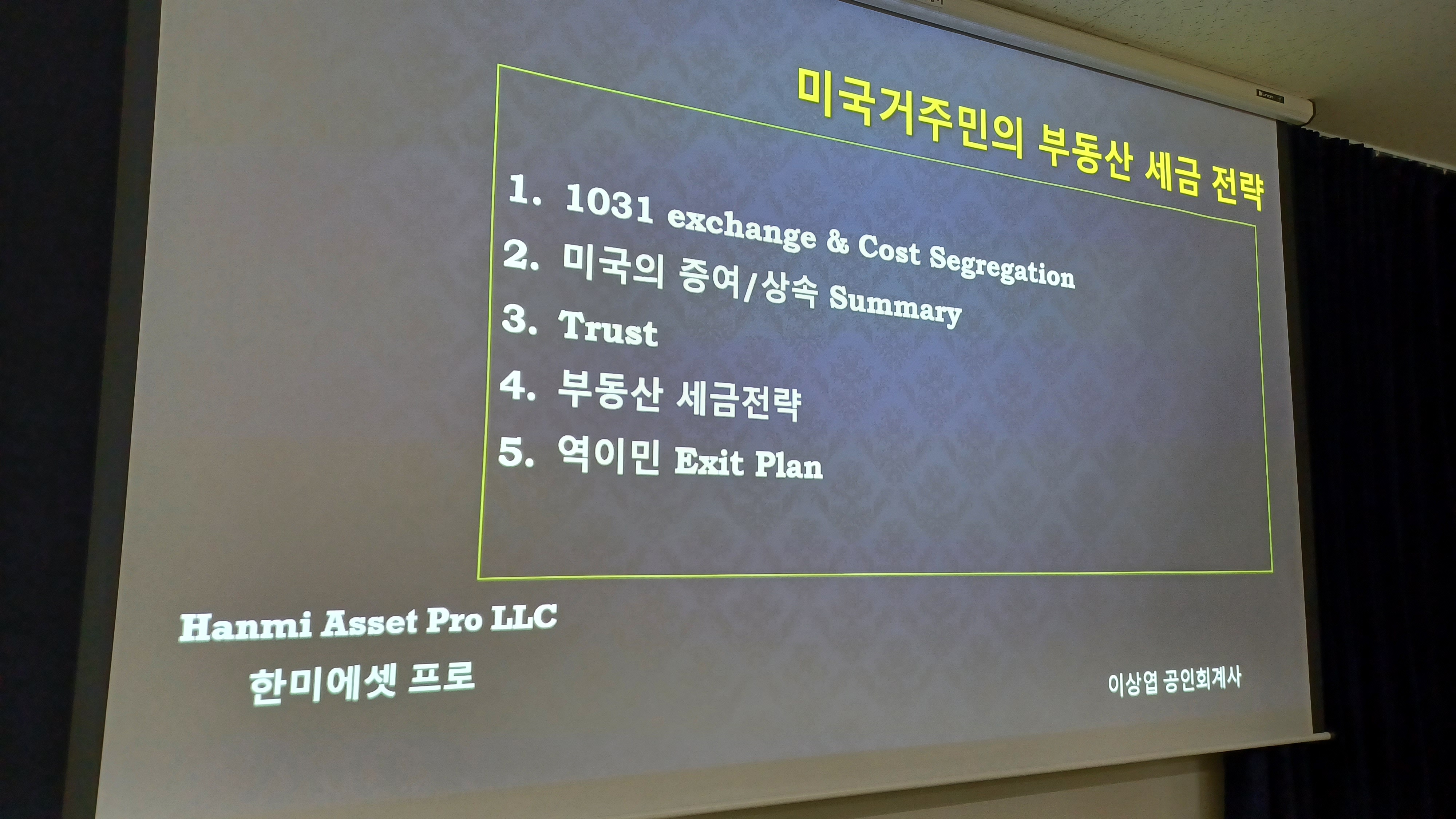 내가 너무 감명 깊게 접하는 이상엽 한미에셋프로가 스피커로 나오는 '크로스보더 부의 지성과 부의 전략이 만나다' 세미나에 참석했다. 지난주 세미나보다는 덜 정신없었던 게 좋았다. 내가 이상엽 미국 CPA의 강의를 듣는 건 이번이 세 번째인데, 일부는 이해가 잘 되지만 트러스트 쪽은 아진 절반정도 알아먹는 것 같다. 첫 번째 연사였던 교수님은 나에게는 큰 도움이 된 내용은 아니었지만말을 엄청 재미있게 하시는 스탠드업 코미디언 같은 느낌이었다^^ 현재를 즐기라고 하는데 내가 과연 그게 되는지 잘 모르겠다. 마지막으로 미국 상업용 부동산 중개업체로 제일 큰 곳의 한국계 부사장님의 프레젠테이션은, 내가 전에는 거들떠보지 않았던 분야의 부동산, 특히 싱글 테넌트 상업용 부동산에 대한 눈을 뜨게 해 준 귀중한 시간이었다.