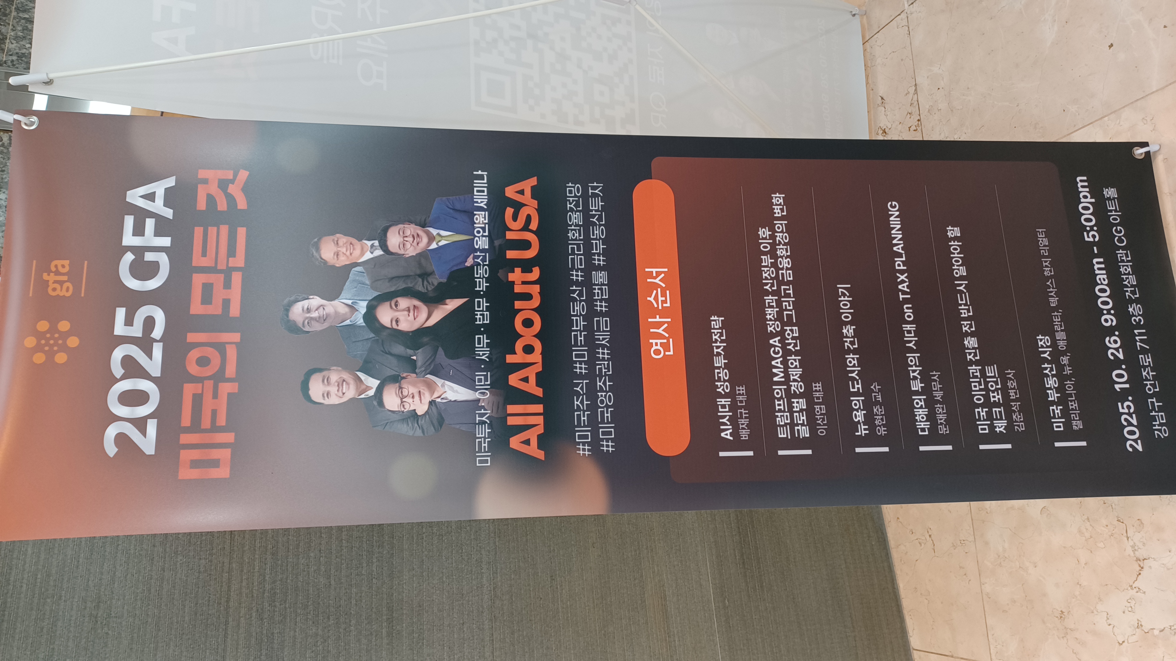 크로스보더 컨설팅 업체 GFA 글로벌 프론티어 에셋에서 주최하는 2025 미국의 모든 것 세미나에 참석했다. 내가 작년에도 GFA 세미나에 참석해봤었는데, 그때나 이번 세미나는 처음으로 한국 바깥으로 나가거나 투자를 시작하려는 분들에게 적절한 입문자용 세미나라고 생각된다. 나는 특히 양국간 세금 부분에 관심있는데, 이쪽은 좀많이 아쉬웠다. 가뜩이나 어려운 세금인데 좀 차근차근 똑소리나게 설명받고 싶다. 개인적으로는 미국 부동산 브로커들이 지역 및 매물, 투자전략을 소개하는 것이 도움되었다.