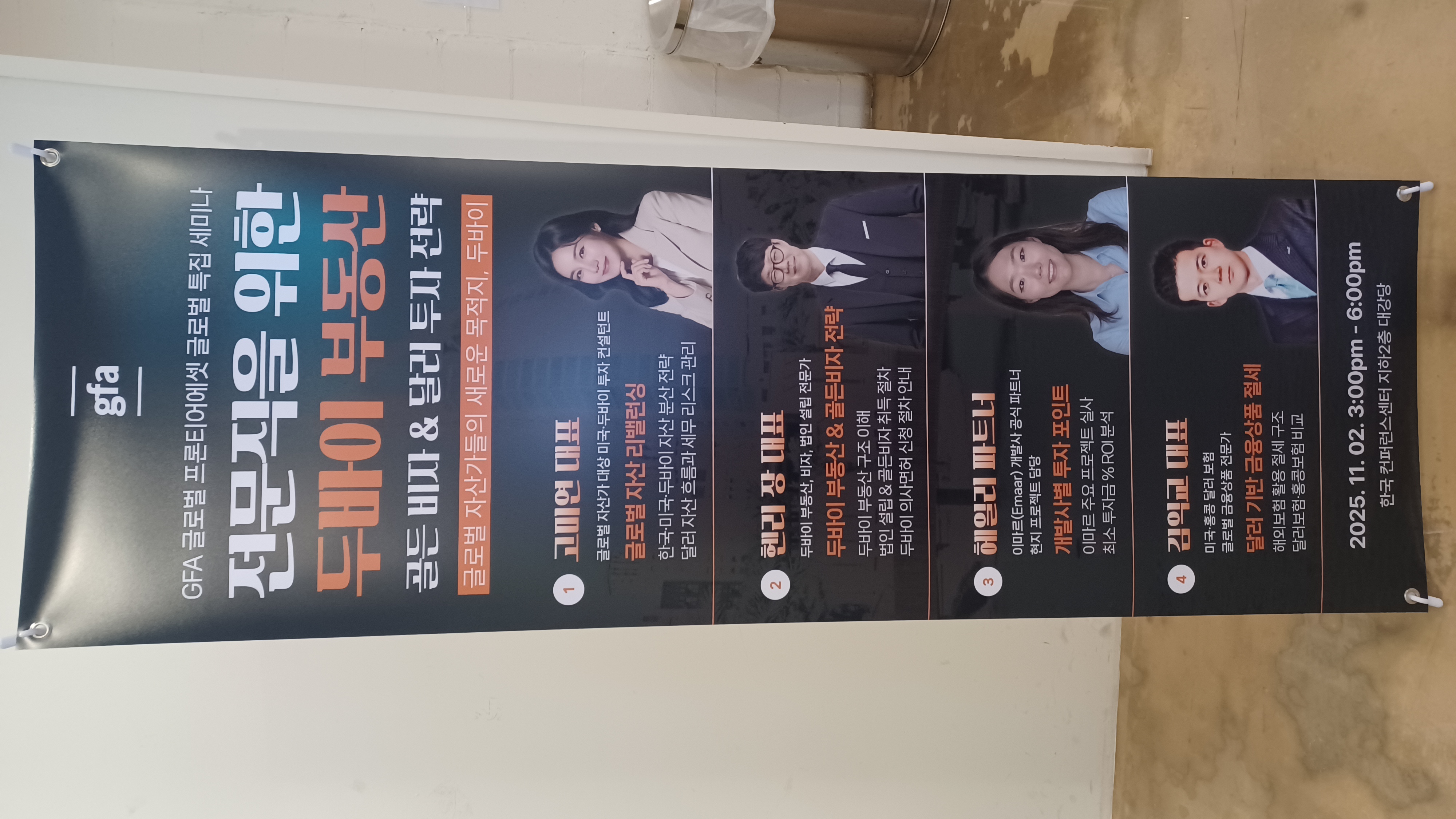글로벌 프론티어 에셋 GFA이 주최하는 전문직을 위한 두바이 부동산 골든 비자 & 달러 투자 전략 세미나에 다녀왔다. 이번 강의는 두바이 부동산 투자의 장점, 의료인이 두바이에 가서 어떻게 먹고 사나에 대한 설명, 두바이 최대 시행사 암만의 프로젝트, 해외 보험상품 소개로 이루어졌다. 두바이는 내게 매우 생소하기 때문에 엄청 도움이 되었다. 특히 소득세, 양도세, 금융소득세 등이 없고, 기껏해야 소비세 5프로와 법인세 9프로만 있어서 절세를 제일 우선순위에 두는 사람들에게는 매력적으로 보였다. 특히 8억인가 이상 부동산 투자를 하면 가족원 최대 5명이 10년짜리 골드비자를 받을 수 있다는 것이 장점이었다. 다만 나는 평생 미국납세자 신분이어서 두바이에 가서 거주한다 한들, 두바이에서 세금을 안 낸 만큼 미국에 세금 보고 할 때 납부해야 할 것 같다.