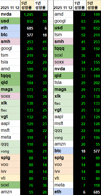 제가 투자하고 있거나 관심이 많은 미국 M7 개별 주식, ETF, 비트코인, 이더리움의 1년, 5년 수익률을 비교해보았습니다.