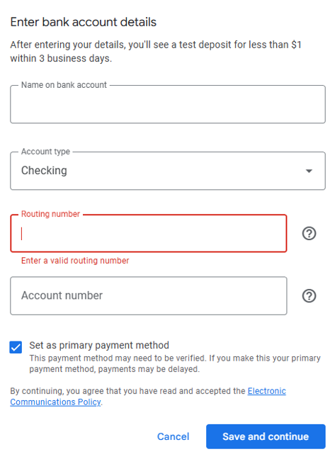 ACH 방법으로 돈을 입금한다고 봤던 것 같아서, 라우팅 넘버는 paper & electronic에 해당되는 번호를 넣고, 계좌번호도 넣었습니다.