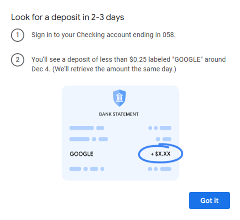 그 계좌를 입력했더니, 구글에서 테스트 삼아 2-3일 안에 1달러 아래로 돈을 보내주니까 verification을 하라고 하네요.