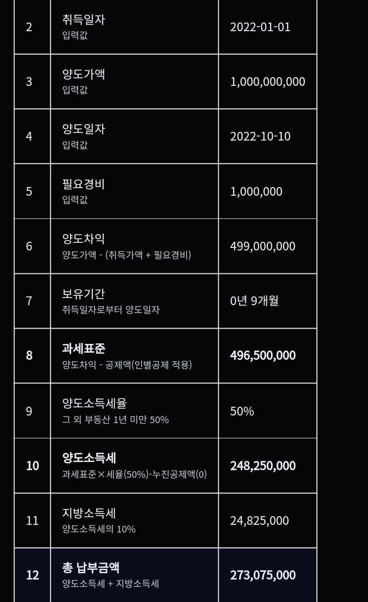 한국에서는 양도 차액이 5억으로 산정되고, 주거 및 비주거 부동산 모두 1억 8천만 원 정도의 양도세가 발생합니다.