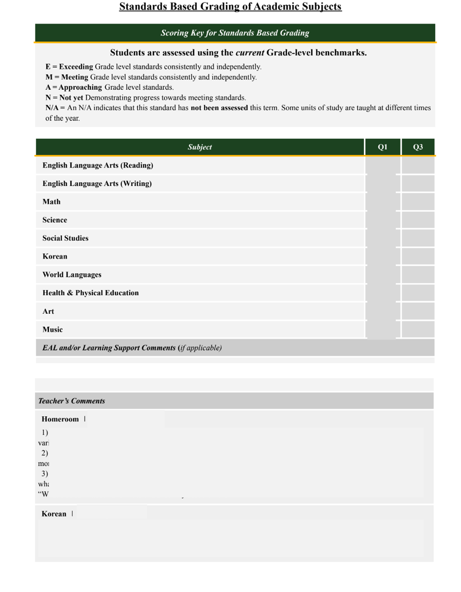 오늘은 초등학교 고학년의 1 쿼터 성적표를 공유합니다.