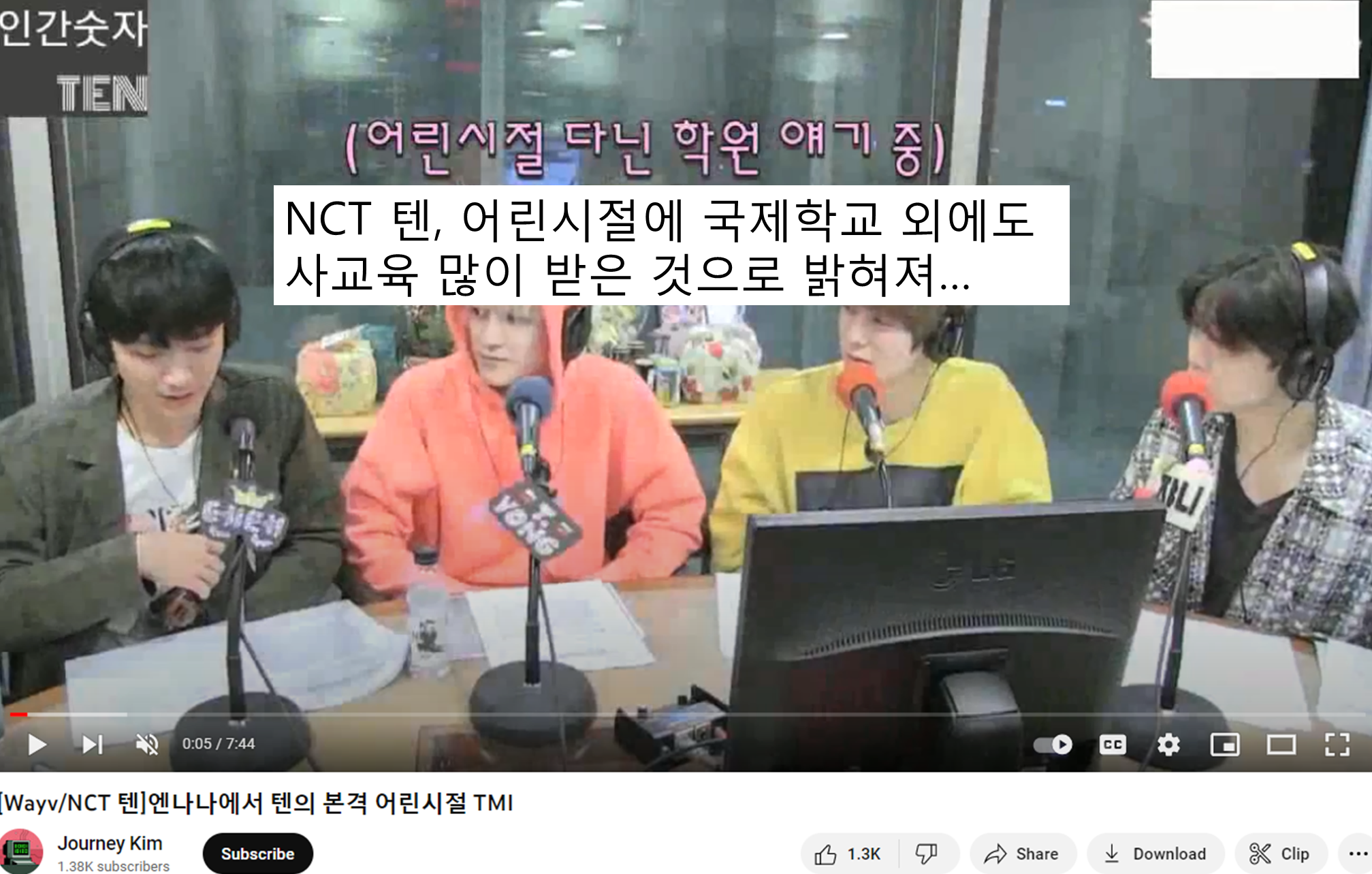 외국인학교나 국제학교에 다닐 경우, 부모 또는 학생이 원하는 아웃풋을 내려면 사교육이 필수 불가결한 것이 아닐까 하는 생각이 많이 듭니다. 제 개인적인 경험도 그렇고, 최근에 NCT WayV 웨이션브이 텐의 어린 시절 인터뷰를 들으니 더 그런 생각이 드네요.