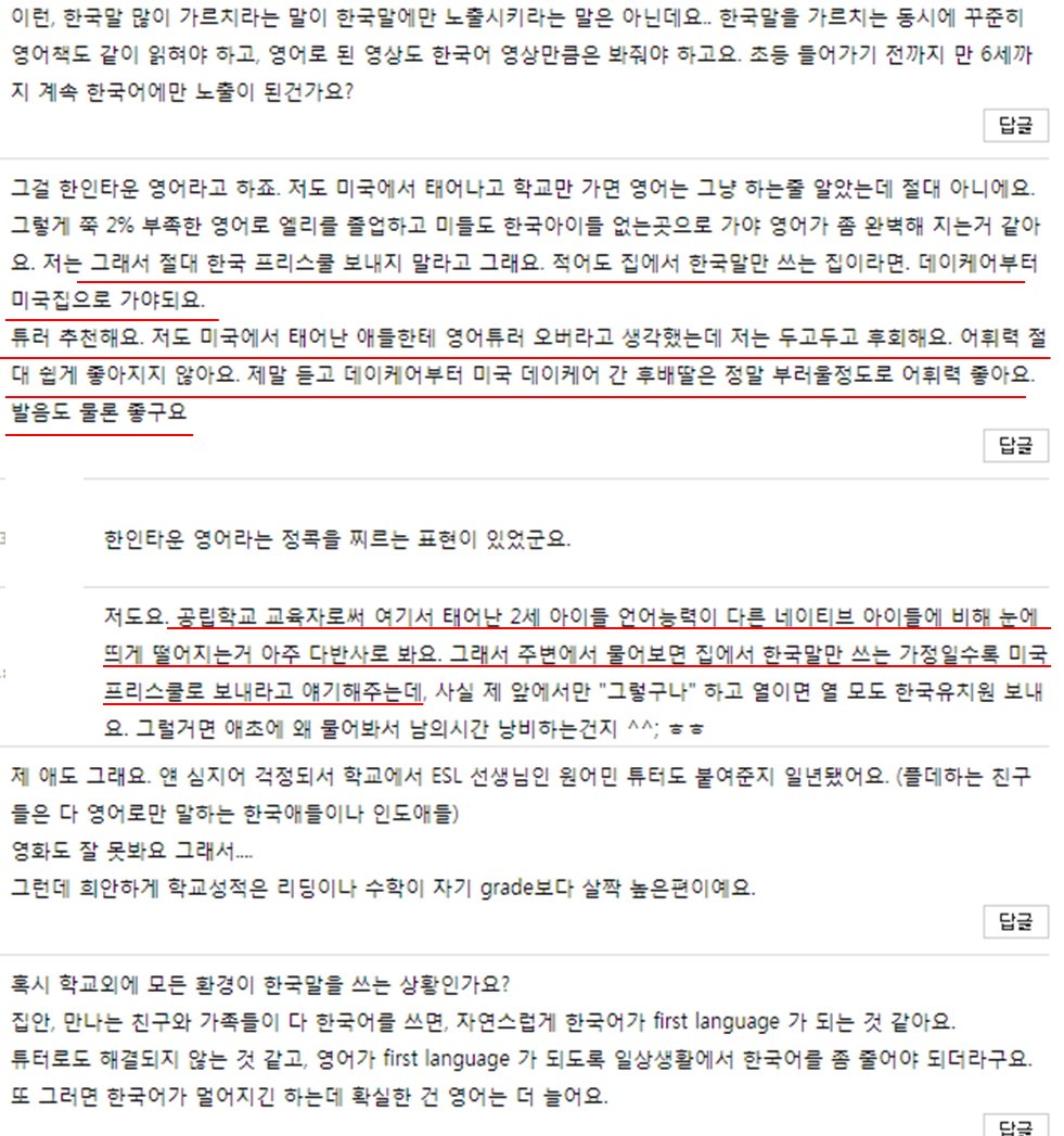 한국어, 영어 모두 잘 해내는 아이를 기르고 싶은 제가 가장 공감한 댓글입니다.