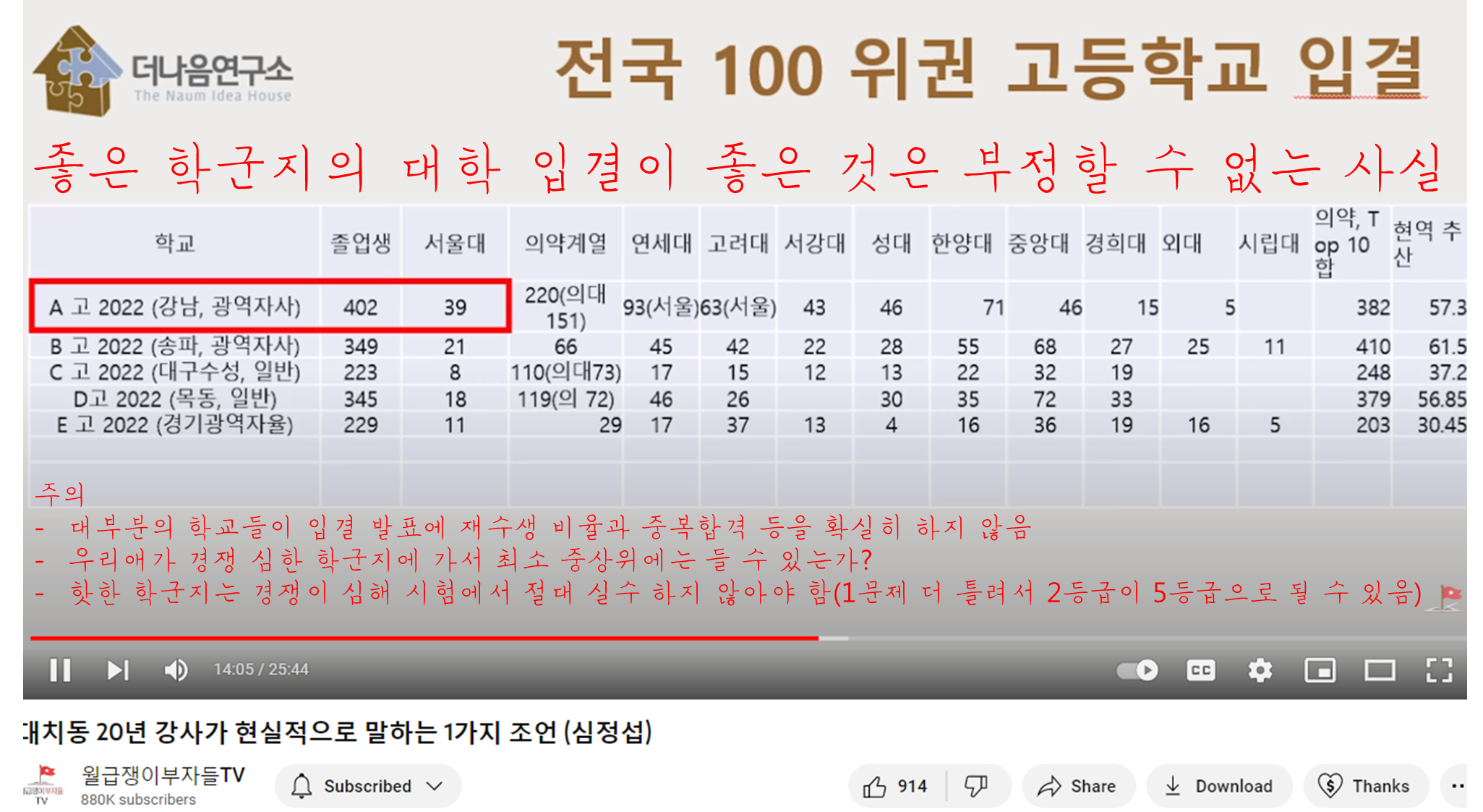유튜브 채널 '월급쟁이 부자' '월부'에서 심정섭 작가의 인터뷰 내용이 좋아 인상 깊은 내용 중심으로 정리해 봅니다. 좋은 학군과 좋은 학교의 표면적으로 보이는 대학 입학결과가 더 좋기는 합니다. 하지만 좋은 학군은 내신 경쟁이 매우 심하기 때문에 아이 성향이 공부머리가 있고 스스로 마음의 준비가 된 후에 가는 것이 좋습니다. 평범한 학군지에서 전교 1등 할 수 있는 아이들이 대치동에서는 하위권 내신 성적을 받을 수 있고, 이는 아이의 공부에 대한 의지 상실, 저조한 내신, 결과적으로 대학 입시 실패로 이어질 수 있습니다. 그리고 사교육비를 영끌하여 쓰는 것보다는 아이의 성향을 보고 적정선에서 지출하고, 부모님의 노후자금 대비나 재테크를 하는 것이 훗날 자식의 짐을 더는 것이라고 이야기합니다.