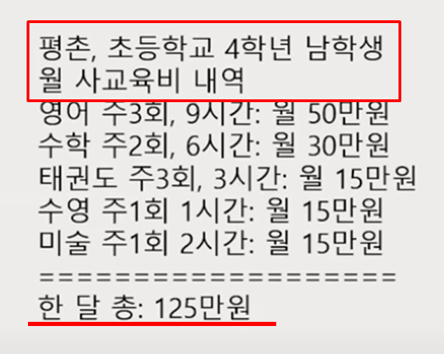 영어(50만 원), 수학(30만 원), 태권도(15만 원), 수영(15만 원), 미술(15만 원)로 한 달 총사교육비는 125만 원이었습니다.