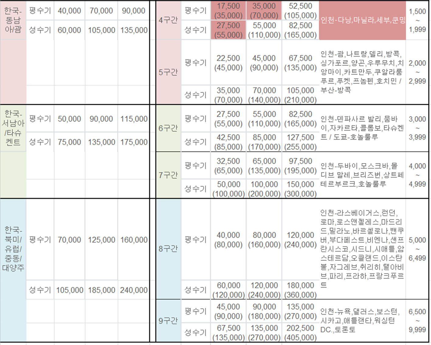 그래서 이 포스팅도 대한항공 이용 시 차감 마일리지만 비교하겠습니다.