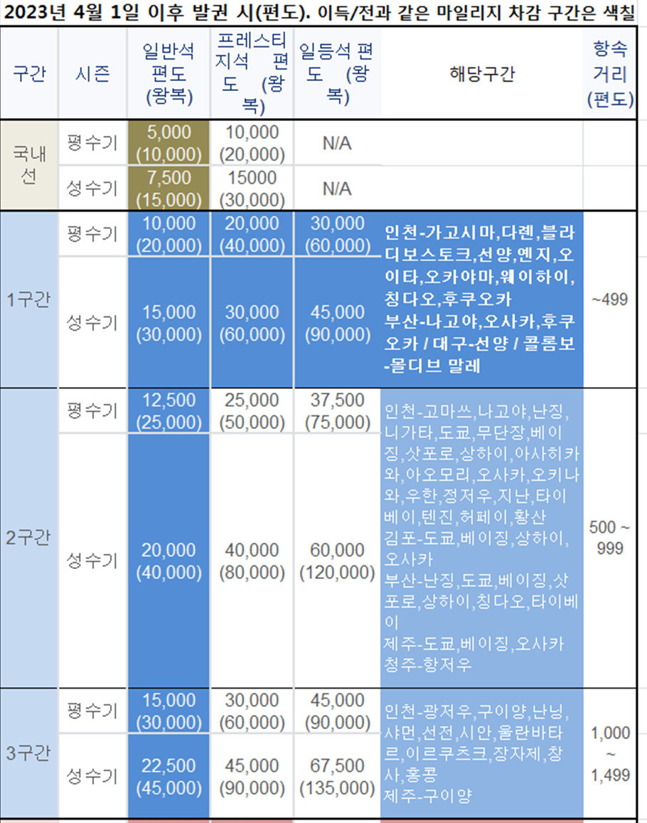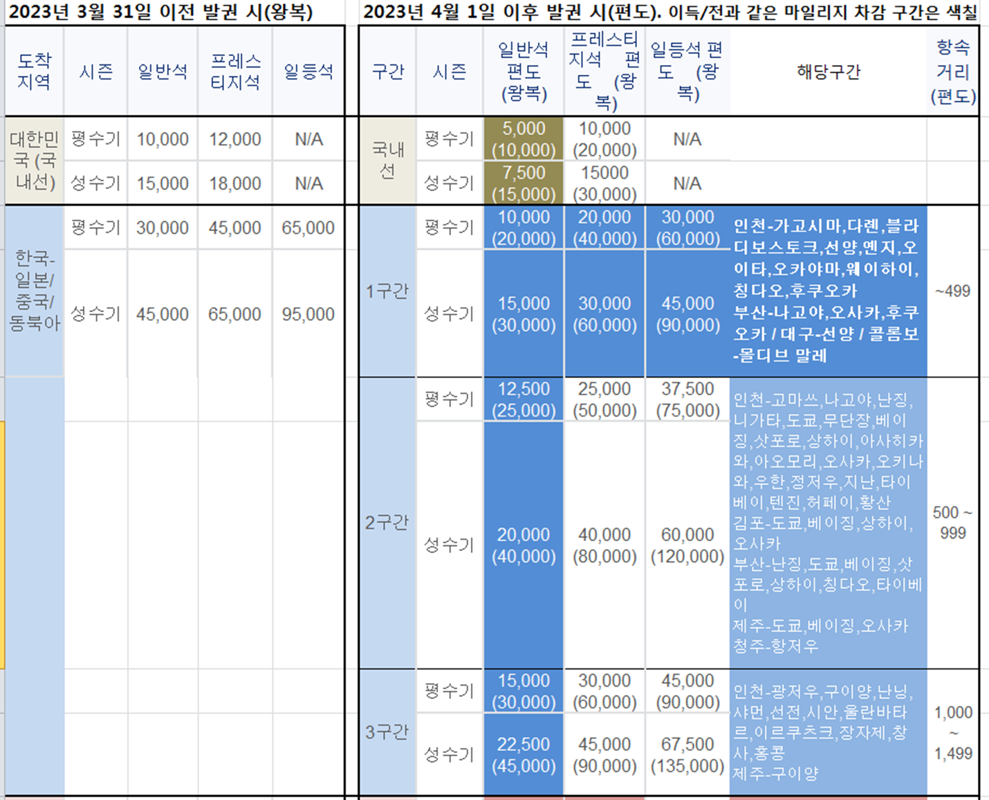 2023년 3월 31일 이전 발권하는 보너스 티켓과 2023년 4월 1일 이후 발권하는 티켓에 차감되는 마일리지는 다음과 같습니다.